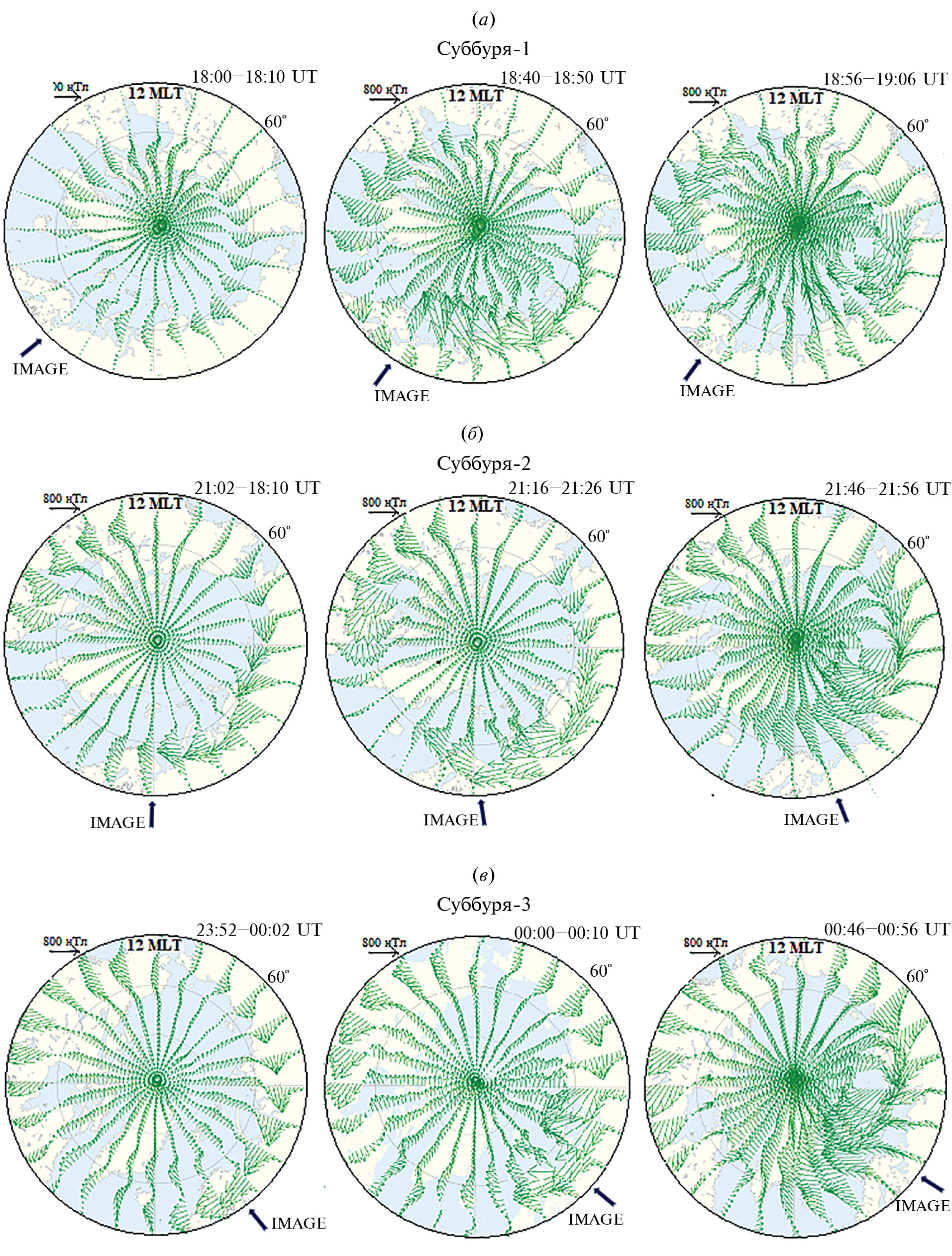 Рис. 2. Карты AMPERE положения электроджетов во время суббурь-1, 2 и 3 (а, б, в соотвественно): левые карты − перед началом суббури, центральные − в момент её начала и правые − вблизи максимума активности. Стрелки − положение меридиана IMAGE.