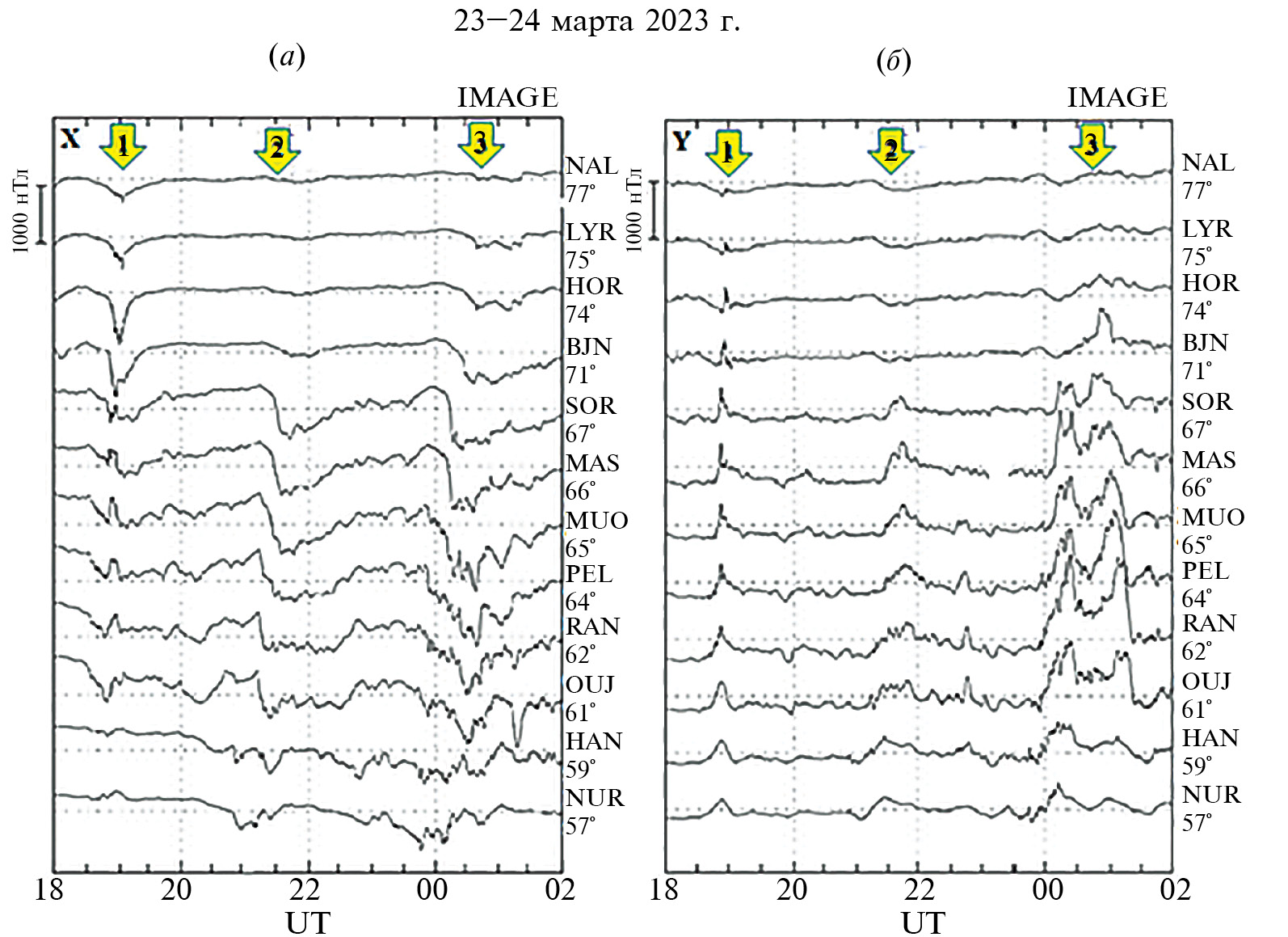 На рис. 3 представлены магнитограммы X- и Y-компонент геомагнитного поля станций меридионального профиля IMAGE в анализируемый интервал главной фазы магнитной бури.