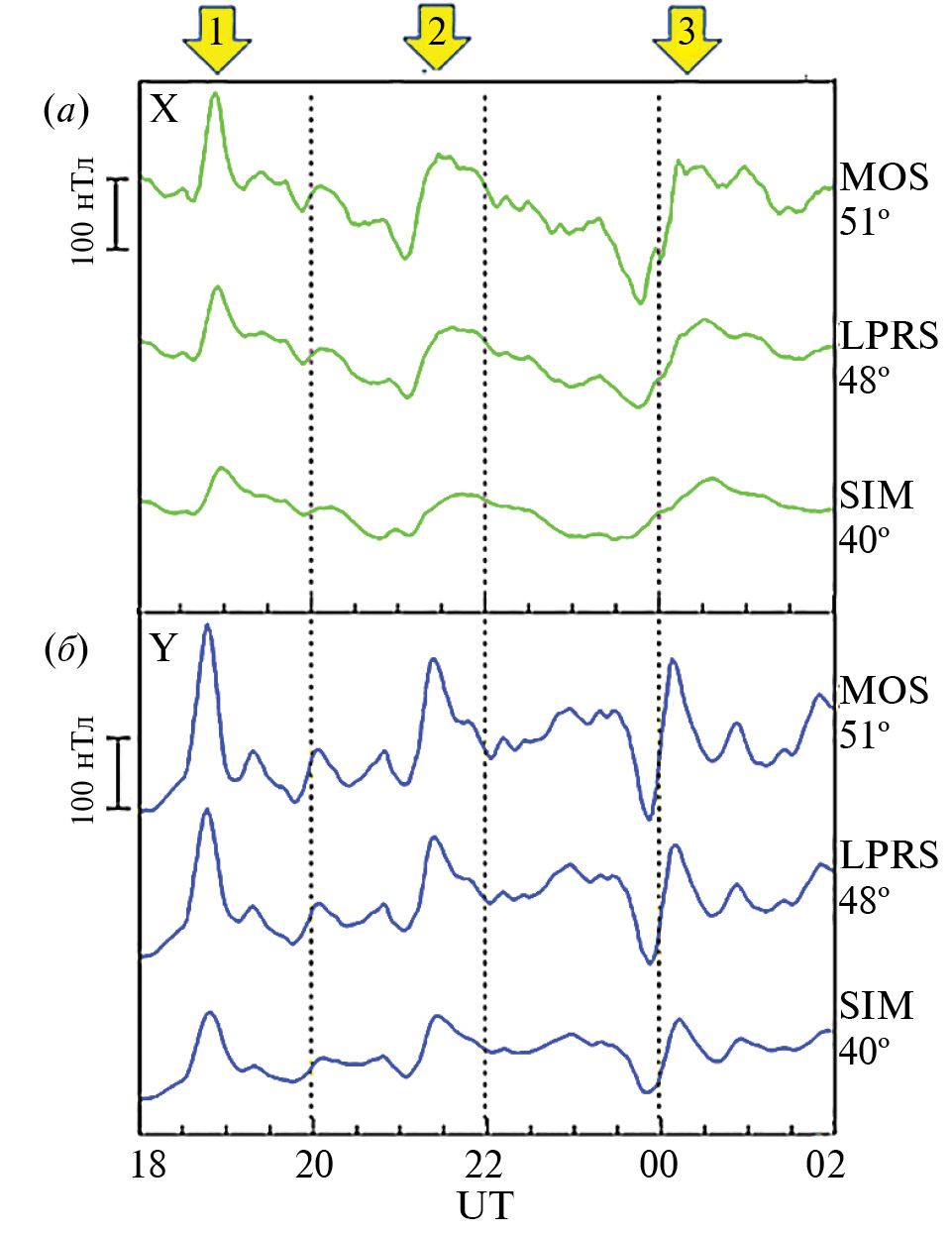 При исследовании среднеширотных магнитных наблюдений во время обсуждаемых суббурь были использованы данные среднеширотных станций ИЗМИРАН, расположенных в том же долготном секторе, что и меридиональный профиль станций IMAGE. К настоящему времени сеть ИЗМИРАН, оснащенная однотипными магнитометрами, состоит из 7 станций на широтах от 34 до 60° MLAT. Для анализа выбранных суббурь использовались данные магнитометров 3-х станций: MOS (Москва, 51° MLAT, 111° MLONG), LPRS (Воронеж, 48° MLAT, 112° MLONG), SIM (Симеиз, Крым, 40° MLAT, 115° MLONG), магнитограммы которых показаны на рис. 4. Из рис. 4а видно, что каждая рассмотренная суббуря сопровождалась положительными отклонениями в Х-компоненте магнитного поля в средних широтах, наиболее ярко выраженными во время суббури-1, что свидетельствует о формировании токового клина суббури. Положительные вариации Y-компоненты магнитного поля во время этих бухт позволяют сделать вывод, что центр токового клина находился восточнее меридиана IMAGE. Однако сложные изменения в развитии геомагнитной обстановки во время суббури-3 отразились в резких скачках в Y-компоненте на среднеширотных станциях, по которым можно сделать вывод о быстром перемещении центра суббури-3 вдоль широты, так как рассматриваемый меридиан находился вблизи центра мощного вихря.