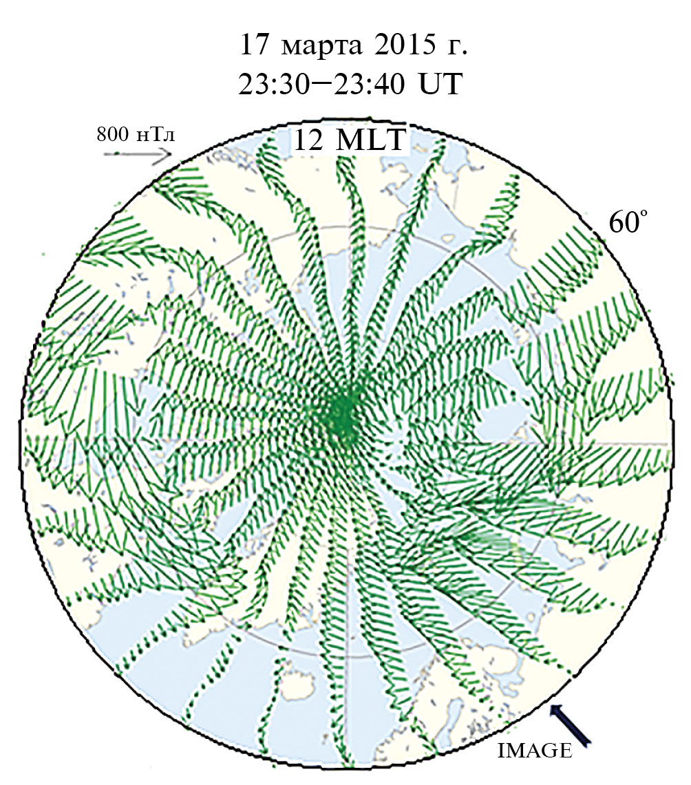 Рис. 5. Событие 17 марта 2015 г.: карта AMPERE положения электроджетов вблизи максимума активности суббури. Стрелки – положение меридиана IMAGE.