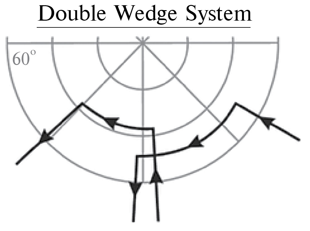 Согласно работе [Gjerloev and Hoffman, 2014] формирование и развитие крупномасштабной токовой системы в утреннем секторе во время максимума активности интенсивной суббури можно схематически представить как результат развития в магнитосфере так называемого двойного токового клина суббури (double wedge system), схема которого приведена на рис. 6. В результате суперпозиции продольных токов на восточном конце токового клина (т. е., утром) будут преобладать втекающие продольные токи, а на западном – вытекающие. В околополуночном секторе будет наблюдаться смешанная слоистая структура продольных токов. Подобная ситуация наблюдалась в начале суббури-2 (рис. 2б, центральная карта).