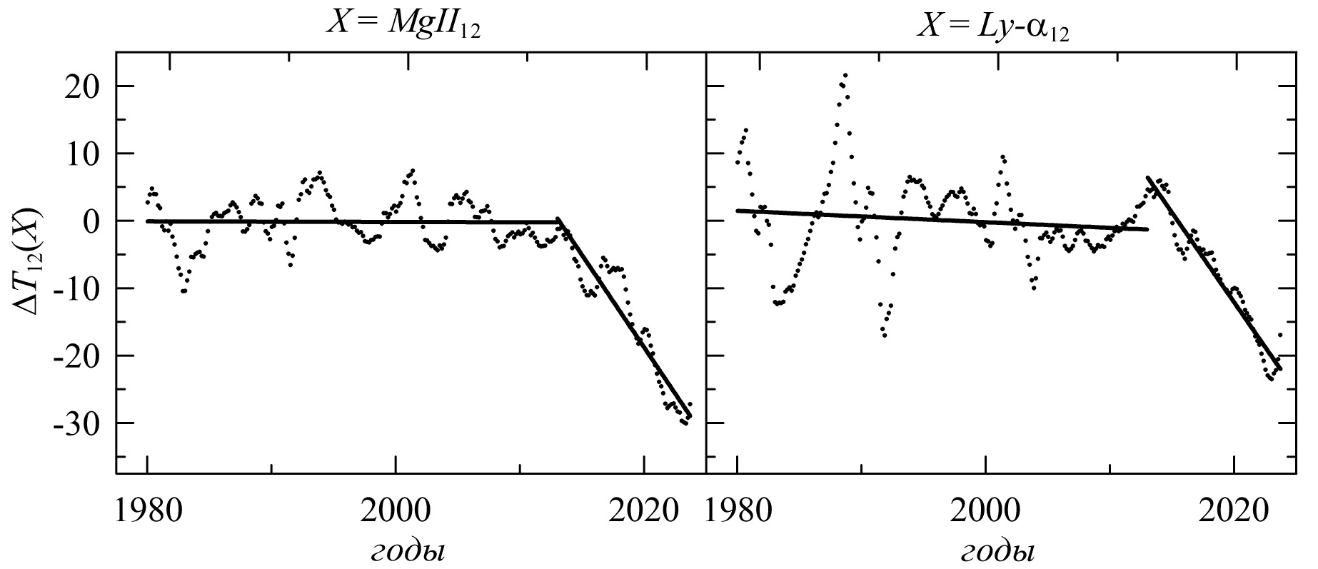В табл. 2 приведены параметры уравнений регрессии (5) для этих интервалов. Из данных в таблице 2 следует, что все анализируемые тренды являются отрицательными (c1 < 0). Для интервала 1980–2012 они не значимы (коэффициенты корреляции K изменяются в пределах 0.01–0.23) с сильными флуктуациями ∆Y(Ly-α12) относительно трендов (σ = 6.5 ± 0.1). Для интервала 2013–2023 все анализируемые тренды значимы, т.е. они отрицательны и усиливаются при переходе от интервала 1980–2012 к интервалу 2013–2023 гг. Самые сильные (c1 = –2.78) и слабые (c1 = –1.42) из этих трендов в интервале 2013–2023 наблюдаются для ∆IG12(MgII12) и ∆T12(F1012). Тренды ∆IG12(X) и ∆T12(X) для совпадающих индексов X отличаются слабо, тем не менее, отрицательные тренды ∆IG12(X) немного сильнее трендов ∆T12(X).
