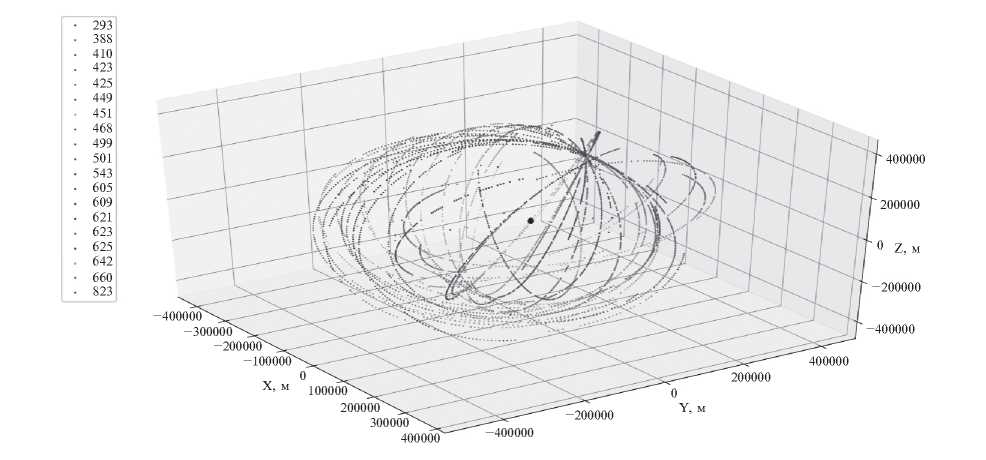 Рис. 3. Витки спутника Космос-321, данные по которым приведены в каталоге [Долгинов и др., 1976], с указанием их номеров.