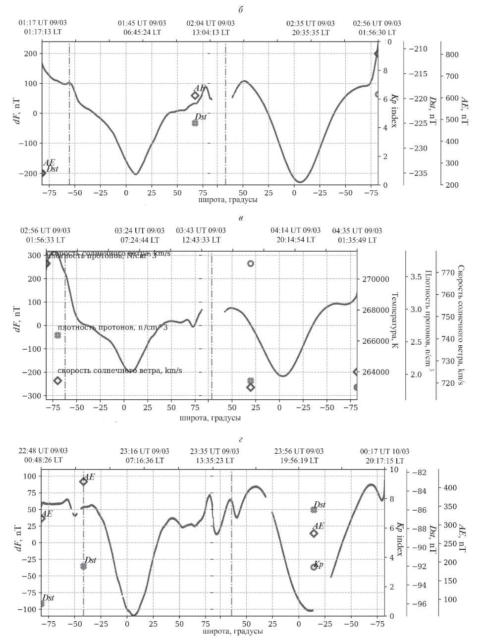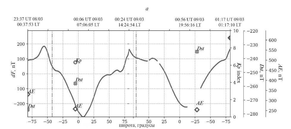 Отдельного внимания заслуживают данные, полученные за виток d4 (22:48 UT 9 марта – 00:17 UT 10 марта) сразу после активизации суббуревой активности, пик которой пришелся на ~17 UT 9 марта (Kp ~6, AE ~900 нТл). C 23:26 UT по 23:45 UT 9 марта спутник как раз пересекал полярную шапку северного полушария, перемещаясь с утреннего сектора на вечерний. На графике dF на соответствующих широтах наблюдается схожая морфология геомагнитных возмущений, как и в аналогичных данных спутника Космос-321 за виток 760, полученных примерно в это же время, с 00:12 UT по 00:26 UT 10 марта, при пересечении спутником южной полярной шапки (рис. 4, данные приведены в [Долгинов и др., 1972]). Эти данные соответствуют фазе затухания суббуревой активности (AE ~350 нТл). В этот период кольцевой ток ослаб (Dst ~ –90 нТл) и заметная асимметрия отсутствует, что позволяет более точно выделить эффекты полярных электроджетов.