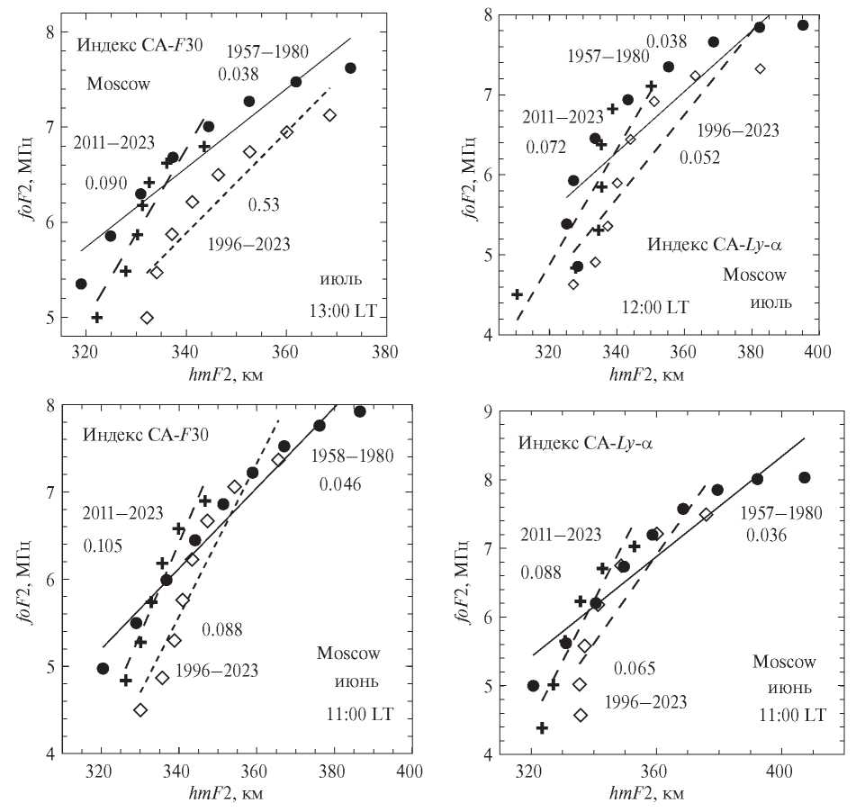 Такая зависимости построена для трех периодов: эталонного 1957–1980 гг., когда не должно было еще быть ионосферных трендов антропогенной природы, и двух последующих 1996–2023 гг. и 2011–2023 гг. Основой указанного анализа служат результаты наблюдений методом вертикального зондирования на двух ионосферных станциях – Moscow и Juliusruh. Рассматриваются пять околополуденных моментов местного времени и два периода – зимний (январь и февраль) и летний (июнь и июль).