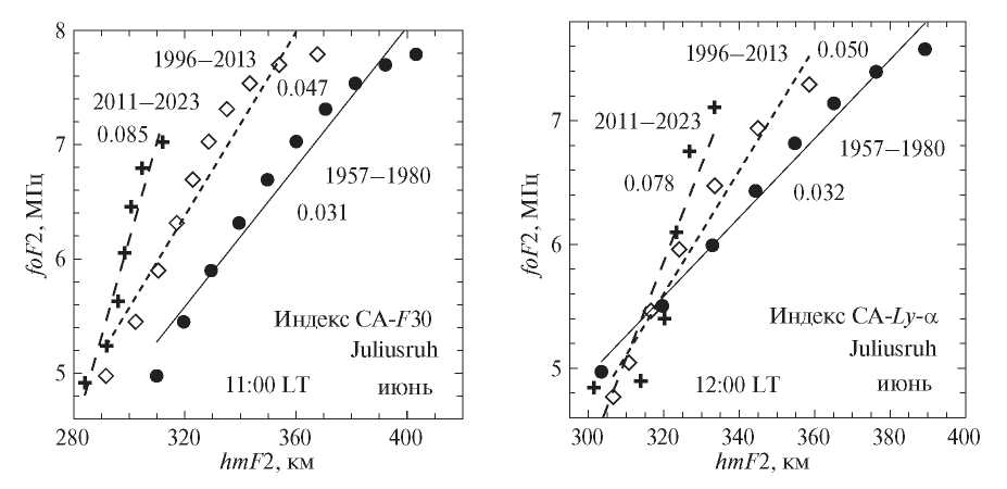 Основной результат предыдущих двух параграфов состоит в том, что для обеих станций (Moscow и Juliusruh) как зимой, так и летом наблюдается увеличение параметра S (наклон зависимости foF2 от hmF2) при переходе от периода 1957–1980 гг. к периоду 1996–2023 гг. и затем к периоду 2011–2023 гг. Анализ проводился для пяти околополуденных моментов LT. Использовались три индекса СА (F30, Ly-α и MgII), которые по нашим данным (см. [Данилов и Бербенева, 2023; Данилов и др., 2023] являются наилучшими для описания поведения foF2.
