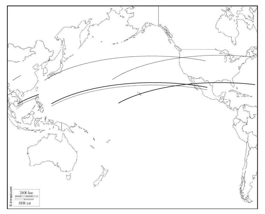 О географическом положении зарегистрированных в этом сеансе САС можно судить по рис. 1, на котором видно, что САС была зарегистрирована в широтном поясе от 15° N до 32° N, при этом ее долготная протяженность составила 160° (от 110° E до 90° W).