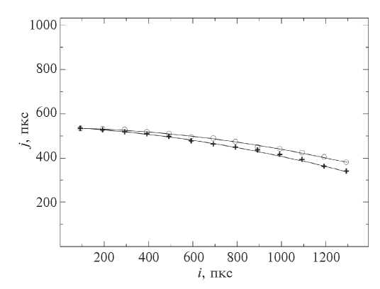 Рис. 3. Действительное и расчетное положение САС на матрицах фотокамер. Крестиками (камера № 4) и кружками (камера № 3) отмечено положение наиболее ярких пикселей центральной части наблюдаемого слоя (см. табл. 2). Тонкая линия соответствует проекции с α=17.3°+0.0°, β=5.66°+1.64°=7.3°, θ=72.0°. Толстая линия – проекция с α=17.3°-0.63°=16.67°, β=5.66°+3.34°=9.0°, θ=72.0°.