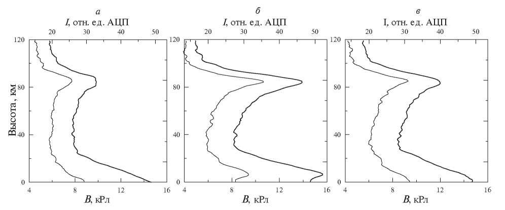Рис. 4. Усредненные вертикальные профили яркости атмосферы. Толстой линией обозначены вертикальные профили яркости атмосферы в интервале длин волн 700 ± 5 нм, тонкой – в интервале 830 ± 5 нм. Профили яркости построены по снимкам, сделанным 07.03.2023 г. в моменты времени: 10:43:46 UTC (а), 13:49:26 UTC (б), 15:22:26 UTC (в).