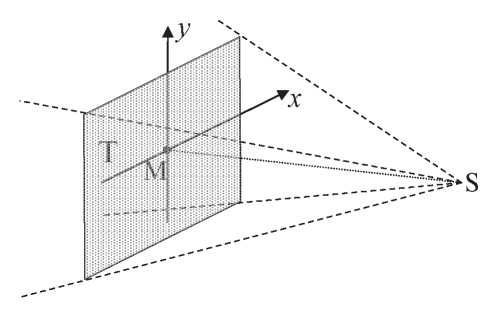 Рис. 7А1. Перспективная проекция на плоскость матрицы. T – плоскость матрицы фотокамеры; S – центр проекции; SM – оптическая ось объектива фотокамеры; длина отрезка SM равна его фокусному расстоянию f, М – главная точка матрицы, т.е. точка пересечения оптической оси O с плоскостью матрицы T.