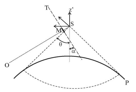 Рассмотрим задачу о проекции горизонта сферы радиуса R на плоскость матрицы, отстоящей от центра проекции S на расстояние f, равное фокусному расстоянию объeктива фотокамеры. При проведении расчетов будем использовать перспективную центральную проекцию, используемую в фотограмметрии, схема которой приведена на рис. 7А1.