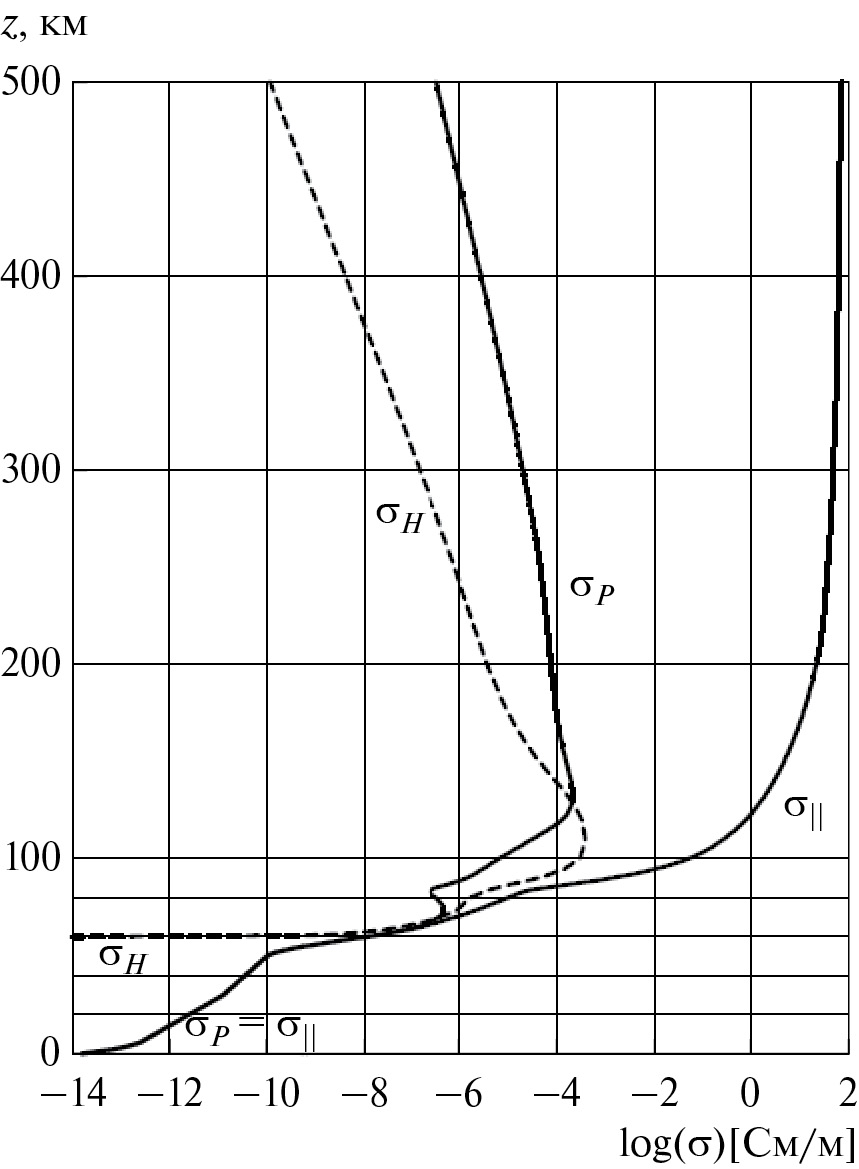 В интервале высот 50 < z < 65 км днем (или 50 < z < 90 км ночью) атмосферное и ионосферное распределения проводимостей объединены с помощью гладкой интерполяции. Для рассматриваемого случая оказалось, что в интервале 50 < z < 60 σP и σ|| практически совпадают, и поэтому построенная по правилам [Denisenko et al., 2008] σH = 0, то есть фактически проводимость воздуха скалярна от земли до высоты 60 км. В обзорах [Мареев, 2010; Siingh et al., 2005] скалярное приближение используется вплоть до высоты 70 км.