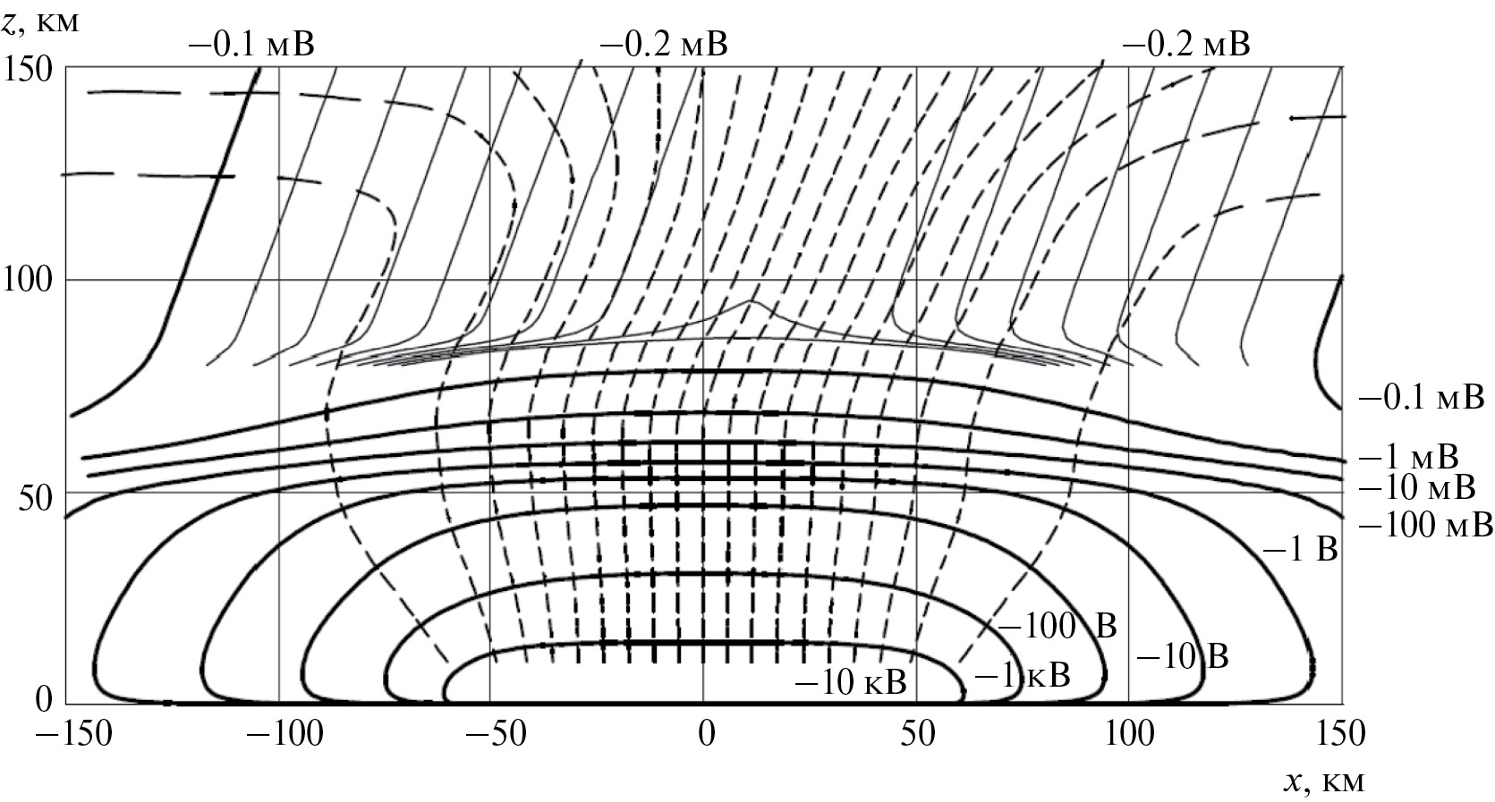 На рис. 2 показаны распределение потенциала и линии тока в вертикальной полуплоскости y = 0, x > 0 в атмосфере над областью эманации радона. При отрицательных x картина практически симметрична. Напомним, что точка x = y = 0 является центром области эманации радона. Поскольку значения потенциала изменяются на много порядков, эквипотенциали построены с одинаковым шагом в логарифмической шкале, между соседними жирными линиями изменение в 10 раз, тонкие построены вчетверо чаще. Штриховыми линиями показаны линии тока, начальные точки которых равномерно расположены с интервалом 5 км × 2 пА/м2 на высоте 50 км. Линии тока указывают направление тока. В двумерном случае постоянен ток, пересекающий любой отрезок, соединяющий точки соседних линий тока. В рассматриваемом трехмерном случае второе свойство отсутствует, поэтому необходимо конкретизировать высоту, на которой линии тока расположены с указанным интервалом. Эта высота взята равной 50 км.