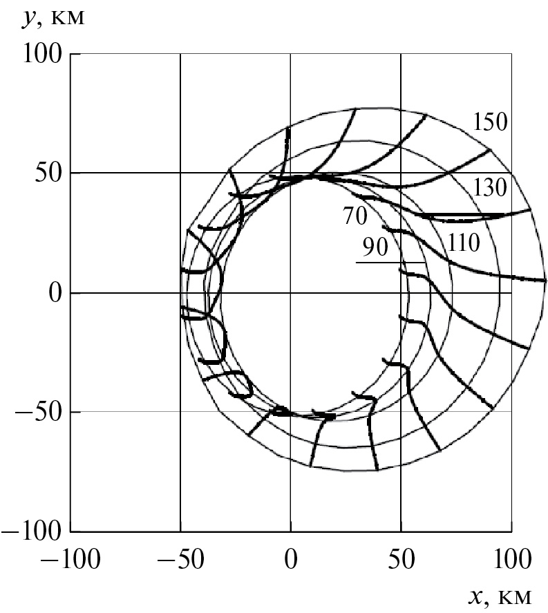 Линии тока для одной из трубок тока δj показаны на рис. 5 в виде их проекций на горизонтальную плоскость. Эти линии тока начинаются из точек, расположенных равномерно по окружности на высоте 50 км. Сечения трубки тока на высотах от 70 км до 150 км показаны тонкими линиями. На рис. 4 видно, что при увеличении высоты трубка тока расширяется и наклоняется ближе к направлению магнитного поля, а рис. 5 показывает еще и ее вращение вокруг собственной оси. Наибольший поворот происходит на высотах 90−120 км, где проводимость Холла существенно превосходит проводимость Педерсена, как это видно на рис. 1. Рисунки 4 и 5 демонстрируют почти вертикальное направление тока на высотах 50−70 км.