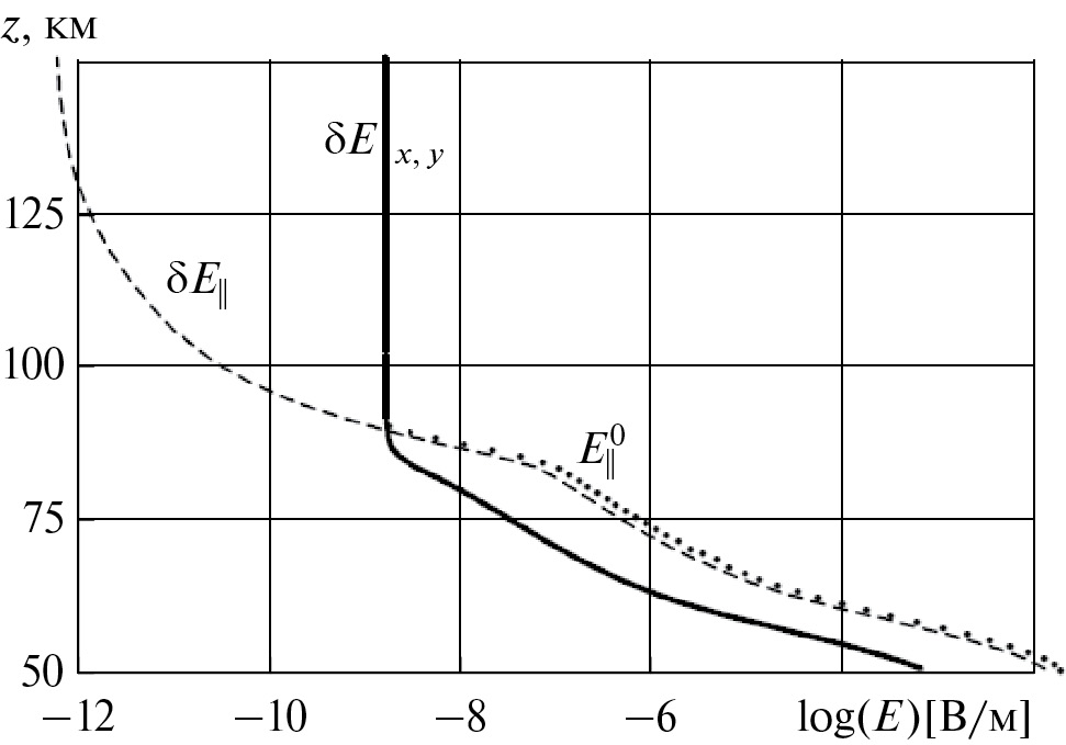 На рис. 6 показан высотный ход компонент напряженности электрического поля. Приведены графики максимальных по модулю значений на данной высоте. Естественно, разные компоненты достигают максимумов при разных x, y. Как видно на рис. 4, возмущения продольной и вертикальной компонент велики над центральной частью области эманации, а δEx – над ее периферией. Компонента δEy в плоскости y = 0, показанной на рис. 4, близка к нулю и велика на периферии области эманации вблизи плоскости x = 0. Рисунок 5 демонстрирует близость решения к осесимметричному со смещением оси вправо с увеличением высоты, соответственно наклону магнитного поля. Ниже 85 км над центральной частью области эманации возмущения горизонтальных компонент намного меньше продольной. В таком случае при заданном магнитном наклонении α = 70° продольная компонента поля отличается от вертикальной компоненты множителем sin(70°)≈0.94, что, к сожалению, незаметно в масштабе рис. 6. Продольная компонента поля хорошей погоды E0|| ниже 90 км показана точками (она не зависит от x, y); максимальное по x, y возмущение этой компоненты δE|| за счет эманации радона (отличие от E0||) − штриховой линией. Изменения с высотой максимальной по x, y величины δEy и совпадающей с ней в масштабе рисунка величины δEx показаны сплошной кривой. Поскольку невозмущенное поле хорошей погоды направлено строго вниз, и, значит, имеет нулевые горизонтальные компоненты, δEx, δEy равны самим Ex, Ey.