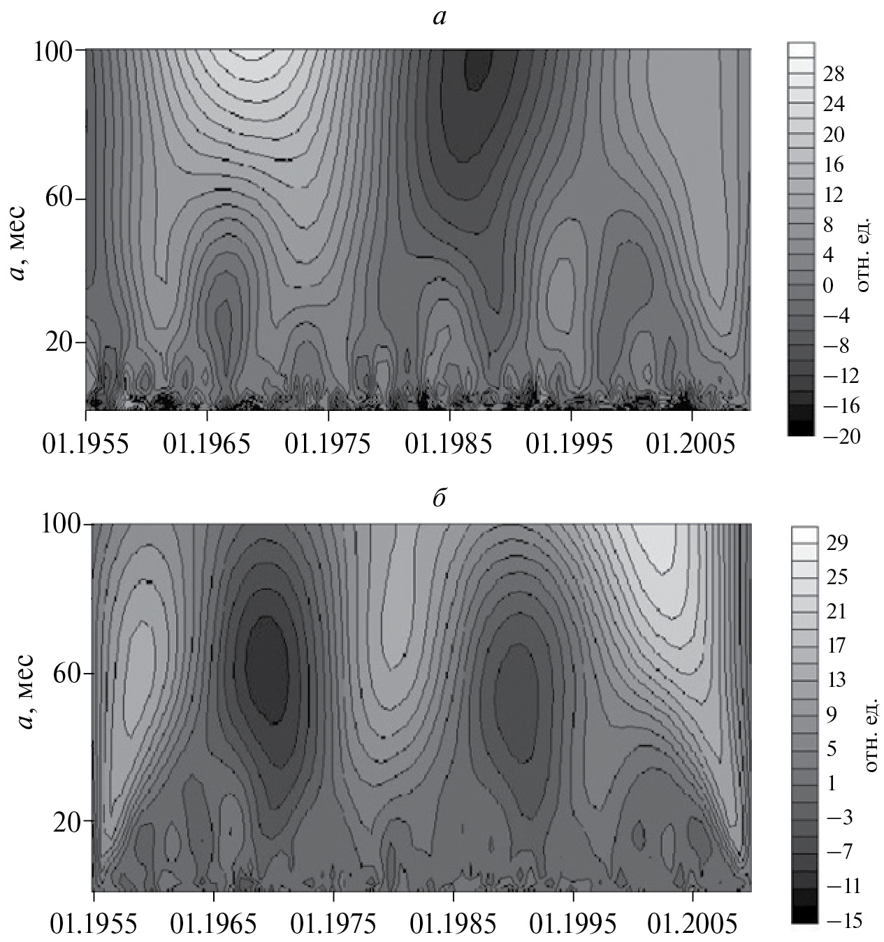 Рассмотрение вопроса о влиянии границ анализируемых рядов данных показало, что оно зависит от значения масштабного коэффициента и для рядов данной длины (порядка 600 точек) прослеживается на краях ряда не более, чем в течение 40 месяцев для значения масштабного коэффициента а = 12 месяцам. С ростом значения масштабного коэффициента глубина влияния границ ряда растет, достигая для значения а = 60 месяцам, в отдельных случаях, до 120 месяцев. Однако следует отметить, что с ростом значения коэффициента а это влияние становится все менее выраженным.