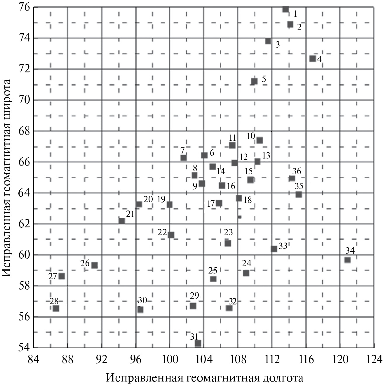 Для исследования событий Рс5 использованы данные 36 трехкомпонентных магнитных станций двумерной сети IMAGE и станций, расположенных на территории России (Лехта − LEH, Карпогоры − KAP, Ловозеро− LOV, Лопарская – LOP). Расположение магнитных станций показано на рис. 1 в исправленных геомагнитных координатах (Норильск – φm = 64.1°, λm = 161.6° находится за пределами рисунка). Ст. Лехта (Карелия, φm = 60.2°, λm = 112.1°) работала временно в период экспериментальных работ СПбФ ИЗМИРАН. Магнитные станции на рис. 1 расположены в интервале исправленных геомагнитных широт φ = 54°–78° и долгот λ = 85° – 121°. Временное разрешение данных на пяти самых высокоширотных станций (рис. 1) составляло 10 с, на остальных станциях – 1 с.