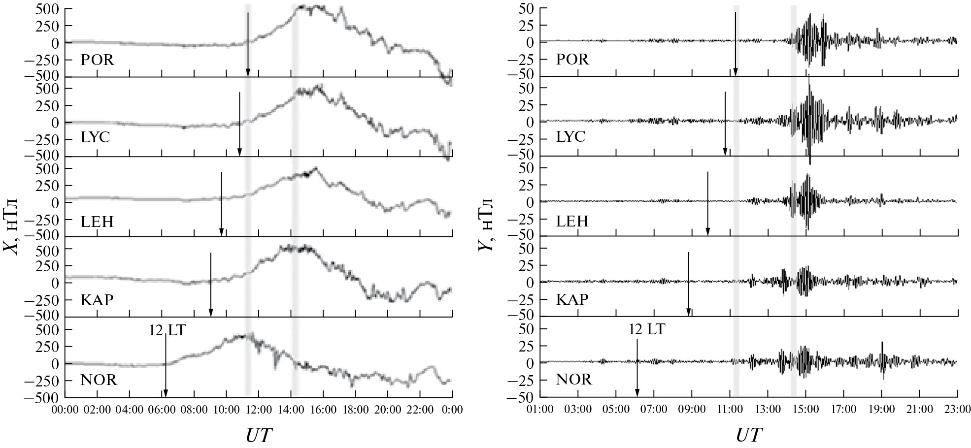 На рис. 2 слева представлены магнитограммы X-компоненты исходного магнитного поля, зарегистрированного на 5 магнитных станциях, расположенных вдоль геомагнитной широты ~ 64°. Мы наблюдаем начало умеренной магнитной бури около локального полудня (отмеченного вертикальными стрелками) на всех 5 станциях и через ~ 5 часов достигается максимальная величина поля. Справа на рис. 2 представлена Y-компонента магнитного поля для 5 магнитных станций, расположенных вдоль геомагнитной широты, близкой, как будет показано далее, к широте расположения центров ионосферных источников Рс5. На этой широте Y-компонента магнитного поля превосходит X-компоненту.