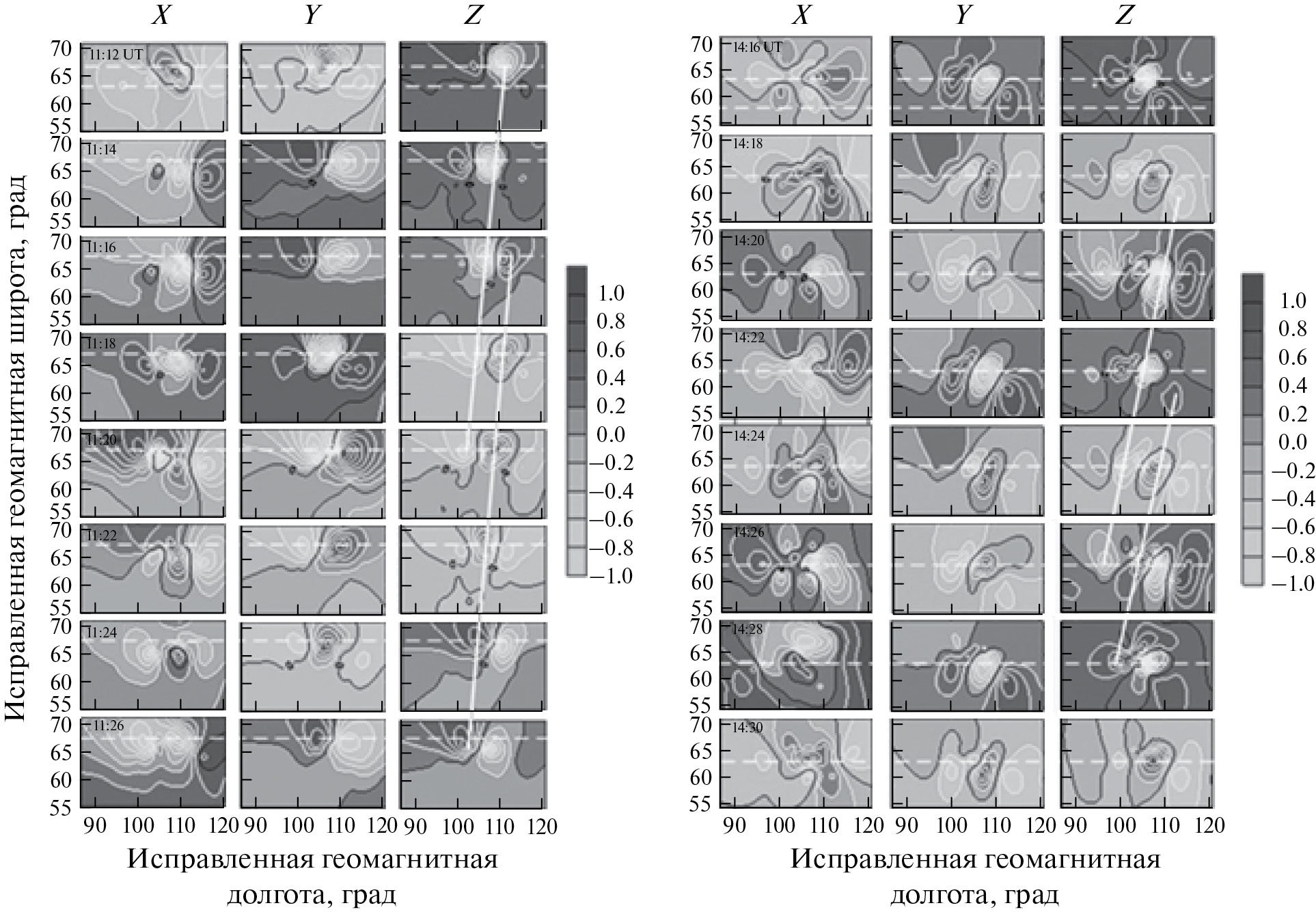 Для построения распределений с шагом 2 минуты выбраны интервалы времени 11:12−11:26 UT (левая панельрис. 4, интервал 1) и 14:16−14:30 UT (правая панель рис. 4, интервал 2) 27.08.2014 г. Заштрихованные полоски на рис. 2 отмечают эти интервалы времени. Первый временной интервал соответствует началу магнитной бури, второй – попадает на время близкое к максимальному значению магнитного поля. Изолинии черного цвета на рис. 4 отмечают нулевые значения амплитуды вариаций Рс5. Поскольку Рс5 имеют период ~ 6 мин, то на рис. 4 в каждой из компонент можно видеть близкое совпадение двумерных распределений с шагом 6 мин (3 кадра). Отметим, что вследствие неполного заполнения магнитными станциями северо-западной и юго-восточной области исследования мы не видим на некоторых кадрах рис. 4 симметричных картинок. На вид построенных пространственных распределений амплитуд Рс5 влияет не только магнитное поле ионосферных источников, а также геоэлектрические особенности земной коры, неоднородности ионосферы и неполная компенсация магнитного поля биркеландовских токов из-за наклона магнитных силовых линий.