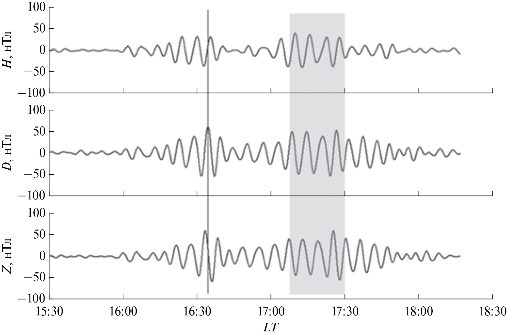 Рис. 5. Магнитограммы трех компонент вариаций магнитного поля 15:30−18:30 LT 27.08.2014 г. п. Лехта фильтрованные в диапазоне периодов Т = 320–400 с. Затененной полосой отмечен интервал 14:16−14:30 UT 27.08.2014 г.