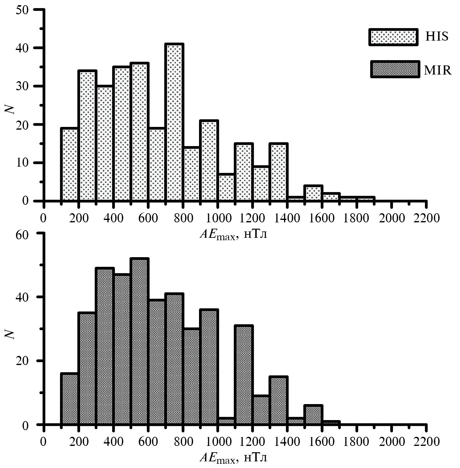 Как уже отмечалось выше, случаи регистрации Pi3 в HIS и MIR наблюдались во время развития суббурь в ночном секторе. На рис. 3 приведена зависимость частоты наблюдения всплесков Pi3 в HIS и MIR от максимальной интенсивности суббурь (AEmax), характеризуемой величиной AE-индекса. Видно, что интенсивность суббурь, во время развития которых наблюдались пульсации Pi3, изменялась в широком диапазоне от 100 нТл до 1000 нТл и более. В HIS пульсации Pi3 преимущественно наблюдались во время суббурь, интенсивность которых составляла 700‒800 нТл, а в MIR величина AEmax в доминирующем числе случаев была 500‒600 нТл. Обычно для классификации суббурь по интенсивности используют величину AL − [Воробьев и др., 2018] или AE − [Fu et al., 2021] индексов. Например, согласно [Fu et al., 2021], если максимальная величина AE-индекса (AEmax) суббурь принадлежит диапазонам 100 нТл < < AEmax ≤ 500 нТл, 500 нТл < AEmax ≤ 1000 нТл или AEmax > 1000 нТл, то суббури считаются слабыми, умеренными или сильными соответственно. Судя по распределению AEmax (рис. 3), в северном и южном полушарии всплески Pi3 возбуждались как во время слабых и умеренных, так и сильных по интенсивности суббурь. Причем, преимущественно, всплески Pi3 в обоих полушариях наблюдались во время развития умеренных суббурь (43% в HIS и 48% случаев в MIR). Вероятность наблюдения пульсаций Pi3 во время развития слабых суббурь была немного ниже (38% в HIS и 36% случаев в MIR). Во время развития сильных суббурь наблюдалось меньше всего случаев пульсаций Pi3 (18% в HIS и 16% в MIR). Таким образом, можно отметить, что возбуждение всплесков Pi3 в северном и южном полушарии происходило, главным образом, на фоне суббурь низкой и средней интенсивности. Средняя амплитуда всплесков Pi3 возрастала с увеличением интенсивности суббурь и примерно была в два раза больше во время сильных суббурь по сравнению со слабыми суббурями.