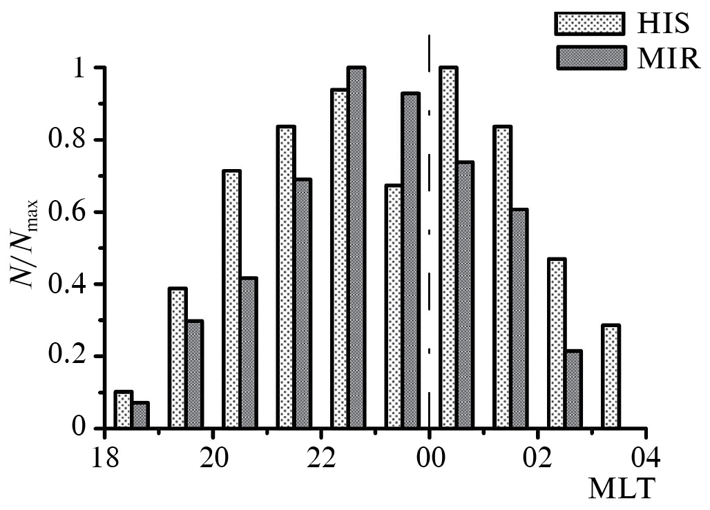Подтверждением преимущественного появления пульсаций Pi3 в ночном секторе магнитосферы является их суточная вариация частоты наблюдения. На рис. 4 показана нормированная на максимальное число случаев зависимость частоты наблюдения N/Nmax всплесков Pi3 в HIS и MIR от локального времени. Наиболее вероятное время наблюдения всплесков Pi3 в двух полушариях приходится на интервал от вечерних до ранних утренних часов. Видно, что суточные вариации всплесков Pi3 в HIS и MIR ассиметричны относительно полуночного меридиана. Распределения N/Nmax в HIS и MIR подобны по форме, но различаются по положению максимумов частоты наблюдения. Так, в HIS максимум частоты наблюдения соответствует послеполуночным часам (00:00‒01:00 MLT). В MIR максимум суточной вариации наблюдается в предполуночное время (22:00‒23:00 MLT).