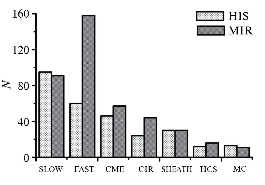 В работе [Дэспирак и др., 2019] показано, что на появление магнитосферных суббурь существенное влияние оказывают крупномасштабные структуры потоков солнечного ветра. Поскольку исследуемые пульсации Pi3 наблюдались в двух обсерваториях во время развития суббурь, представлялось целесообразным выяснить, во время каких типов потоков солнечного ветра происходит их возбуждение. Для этого мы использовали “Каталог крупномасштабных явлений солнечного ветра для периода 1976–2002 гг.”, в котором отражены как квазистационарные, так и возмущенные типы солнечного ветра. Проводилось одновременное сопоставление временных интервалов регистрации пульсаций Pi3 в HIS и MIR и наблюдения различных типов крупномасштабных течений солнечного ветра. Результаты анализа показали, что всплески Pi3 наблюдались в HIS и MIR на фоне семи типов крупномасштабных структур солнечного ветра. Эти структуры идентифицированы в каталоге [Ермолаев и др., 2009], как 1) медленное квазистационарное течение плазмы солнечного ветра из корональных стримеров – SLOW; 2) высокоскоростное течение солнечного ветра из корональных дыр – FAST; 3) выбросы корональной массы (Coronal Mass Ejection – CME); 4) область сжатой плазмы на фронте быстрых течений из полярных корональных дыр и медленных течений из корональных стримеров (Corotating Interaction Region – CIR); 5) область сжатия перед передним фронтом поршня – SHEATH; 6) гелиосферный токовый слой (Heliospheric Current Sheet – HCS); 7) магнитные облака (Magnetic Cloud – MC). Однако, как следует из гистограммы зависимости частоты наблюдения всплесков Pi3 в двух обсерваториях от перечисленных выше типов течений солнечного ветра (рис. 5), доминирующая часть всплесков Pi3 в HIS (33% случаев) наблюдалась на фоне SLOW, а в MIR (39% случаев) на фоне FAST. Число случаев всплесков Pi3, наблюдавшихся в HIS на фоне других течений было существенно меньше и составило: FAST ‒ 21%, CME ‒ 16%, CIR ‒ 9%. В MIR всплески Pi3 наблюдались на фоне SLOW –в 22% случаев, CME – в 14% случаев, CIR – в 11% случаев. На фоне SHEATH, HCS и MC как в HIS, так и в MIR наблюдалось менее 10% случаев (рис. 5).