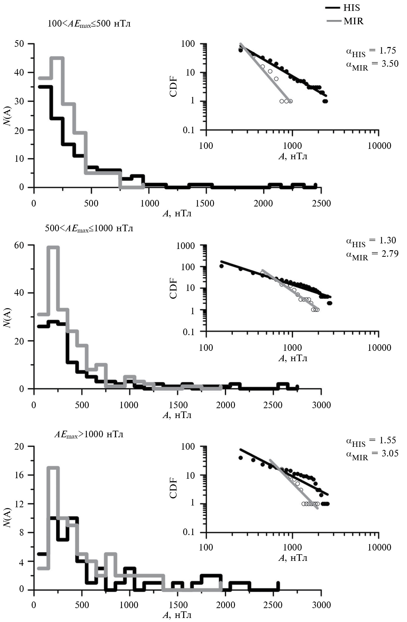 Как видно из рис. 6, независимо от интенсивности суббурь распределения амплитуд пульсаций Pi3 в северном и южном полушарии имеют негауссову форму (сильнее выражены хвосты распределений). Заметим, что подобные распределения называют распределениями с “тяжелыми хвостами” (heavy tails или fat tails). По обыкновению хвосты таких распределений довольно хорошо аппроксимируются степенной функцией вида: f(x)= x-α (α ‒ показатель степени) при всех x, превышающих некоторый порог x0 (x>x0) [Малинецкий, Потапов, 2000]. Применительно к пульсациям Pi3 распределения амплитуд всплесков для трех кластеров, выделенных по признаку интенсивности суббурь, следуют степенному закону f (A) = A-α, где A – амплитуда всплесков, α − показатель степени. Однако, степенные законы в HIS и MIR, которым подчиняются распределения амплитуд всплесков Pi3, значительно различаются, о чем свидетельствуют разные наклоны аппроксимирующих прямых. Одной из особенностей полученных распределений является существенное различие величины показателя α в HIS и MIR. В северном полушарии величина показателя α существенно меньше, чем в южном полушарии (αHIS < αMIR), и иногда может различаться примерно в 2 раза. Более того, значения показателя α в HIS меньше, чем в MIR независимо от того, к какому кластеру относятся пульсации Pi3. Другой особенностью полученных распределений является то, что как в HIS, так и в MIR показатель α больше по величине во время слабых суббурь, чем во время умеренных и сильных. Так, в HIS показатель перемежаемости во время слабых суббурь равен α = 1.75, а во время умеренных и сильных α = 1.30 и α = 1.55 соответственно. Аналогичная тенденция изменения параметра α характерна для случаев наблюдения в Pi3 в MIR. Величина показателя α в MIR для кластера слабых суббурь составляет α = 3.50, а для умеренных и сильных суббурь α = 2.79 и α = 3.05 соответственно.