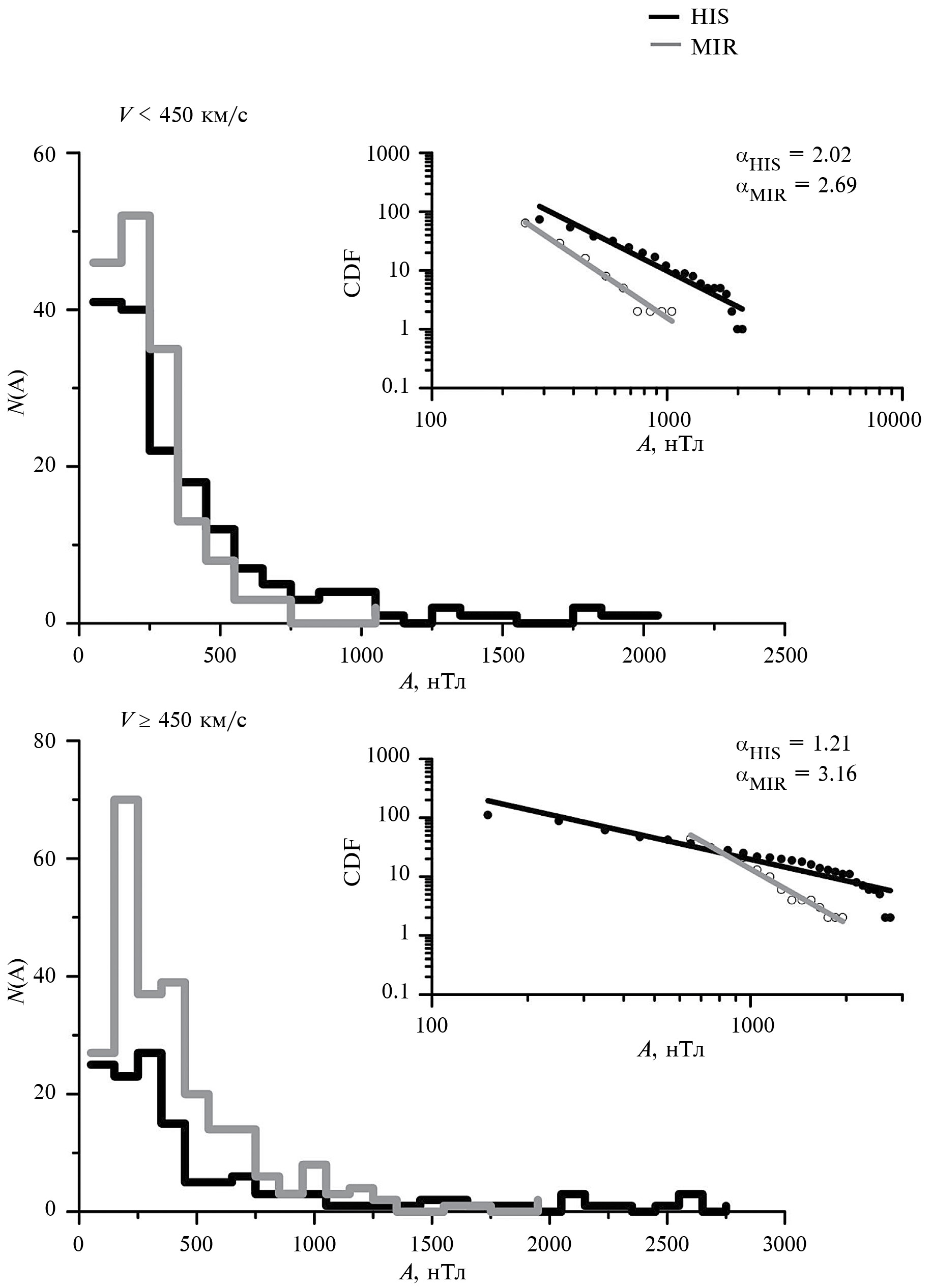 Исследование свойств перемежаемости пульсаций Pi3 в зависимости от условий космической погоды по аналогии с предыдущим разделом также основано на делении всех анализируемых случаев на кластеры. Так, из рис. 5 следует, что всплески Pi3 в HIS и MIR, главным образом, наблюдаются во время SLOW и FAST соответственно. Согласно каталогу [Ермолаев и др., 2009] плазменные потоки, скорость которых V < 450 км/с, рассматриваются как медленные потоки – SLOW, а потоки с V ≥ 450 км/с как быстрые потоки – FAST. Исследование зависимости частоты наблюдения пульсаций Pi3 от скорости солнечного ветра показало, что в HIS 55% и 45% случаев пульсаций Pi3 наблюдалось при V < 450 км/с и V ≥ 450 км/с соответственно. В MIR пульсации Pi3 преимущественно (61% случаев) наблюдались при V ≥ 450 км/с, а при V < 450 км/с в MIR наблюдалось всего 39% всплесков Pi3. В связи с этим представляется целесообразным сравнить характер распределений амплитуд всплесков Pi3 на каждой из обсерваторий для двух кластеров: всплесков Pi3, наблюдаемых при V < 450 км/с и при V ≥ 450 км/с.