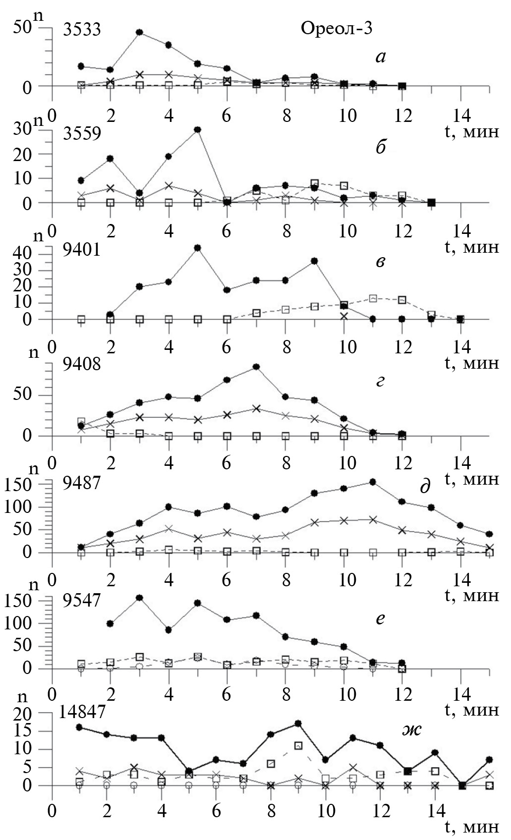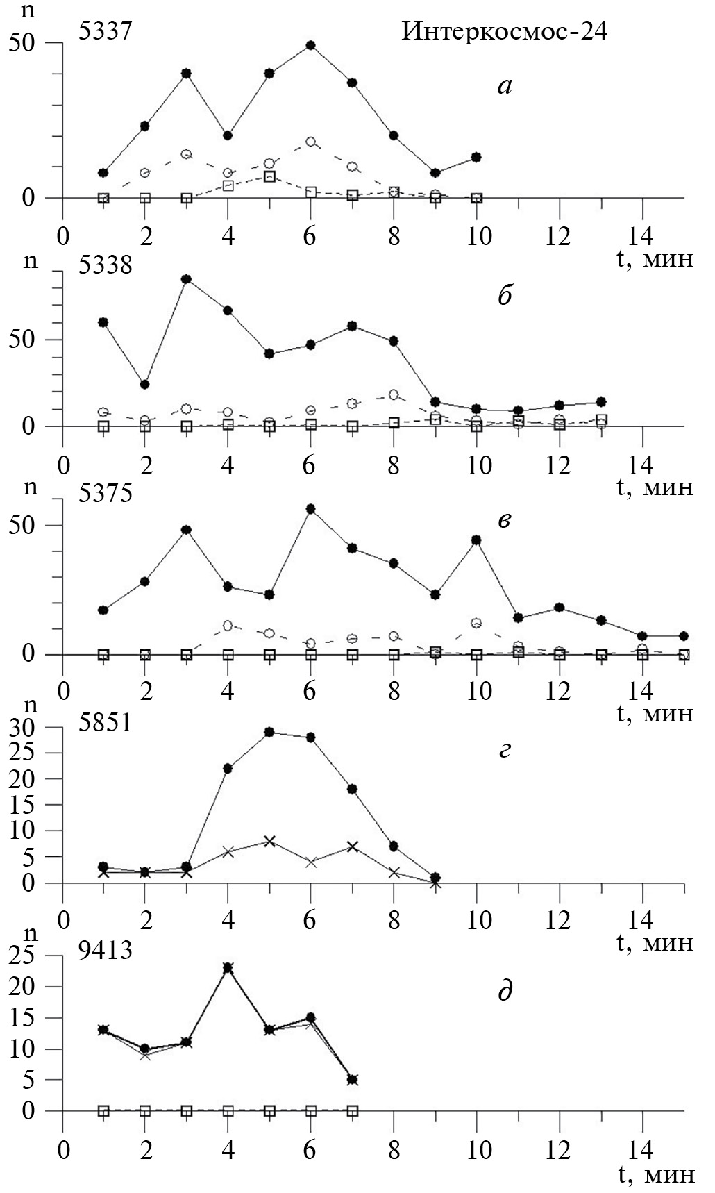 Рис. 2. Зависимость от времени числа сигналов в минуту, n(t) вдоль орбиты спутника ИК-24 на витках: (а) – 5337; (б) – 5338; (в) – 5375; (г) – 5851; (д) − 9413. Сплошная толстая линия и черные точки – ч. д. СА, тонкая линия и крестики – ч. д. КНЧ СА, прерывистая линия и полые кружочки – ПСА, пунктирная линия и полые квадратики – СА разного типа.
