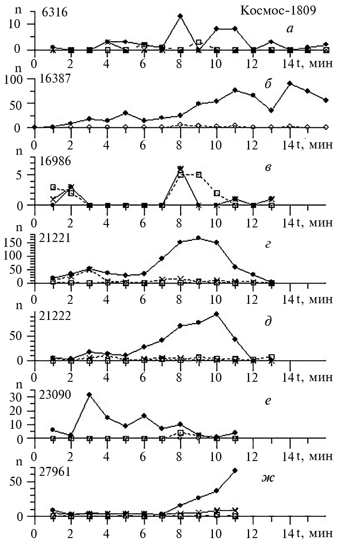 Рис. 5. То же, что на рис. 2 для спутника Космос-1809 на витках: (а) − 6316; (б) − 16387; (в) − 16986; (г) −21221; (д) − 21222; (е) − 23090, (ж) − 27961.