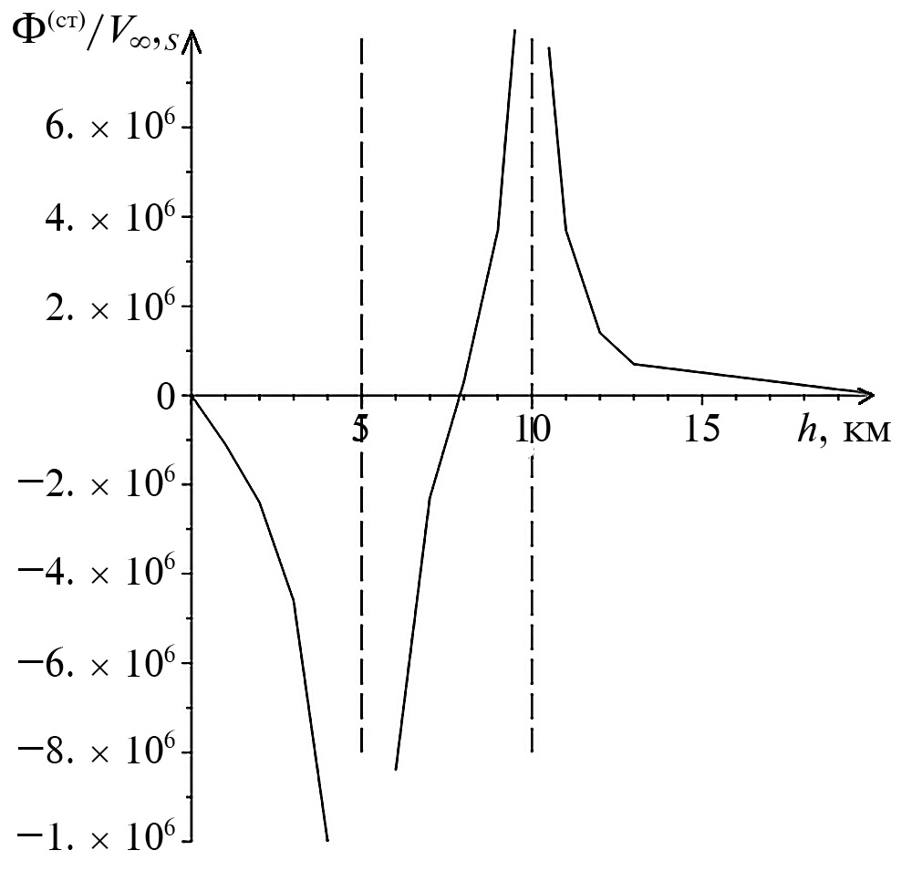 1. Если , формулы (П1.35) (П1.37), определяющие решение краевой задачи, представляют собой функциональные ряды, которые сходятся во всем шаровом слое, кроме точек расположения зарядов, но сходятся неравномерно и очень медленно. На рис. 1 приведен график стационарной части этого решения, нормированной на ионосферный потенциал, в зависимости от высоты на радиальном луче расположения зарядов. Для построения графика проводились расчеты решения в нескольких точках интервалов (0, 4.5], [5.5, 9.5], [10.5, 20) оси и использовалась линейная интерполяция. При этом для нахождения суммы ряда с точностью до первых двух значащих цифр приходится использовать частичные суммы ряда с .