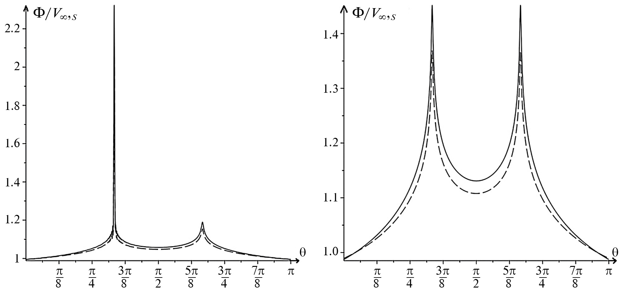 Рис. 2. Графики функции (штриховая линия) и функции формулы (П2.1) в зависимости от угла θ в фиксированный момент времени при фиксированных h, . Левый график соответствует правый