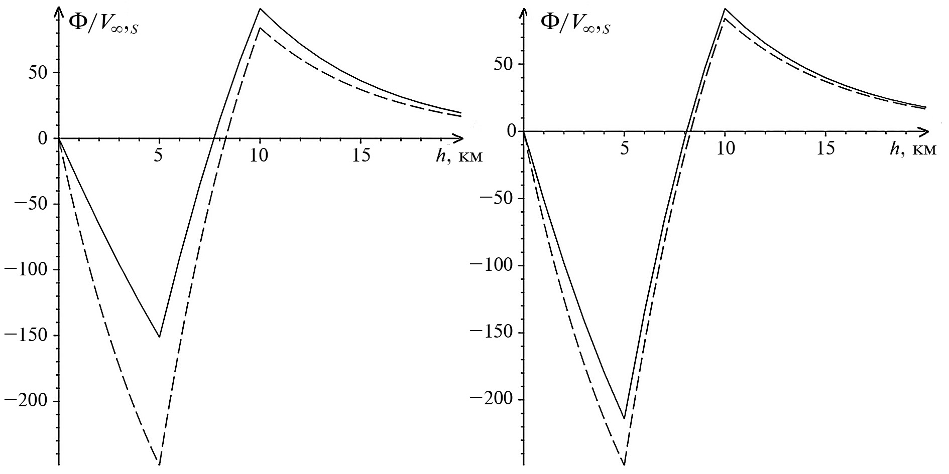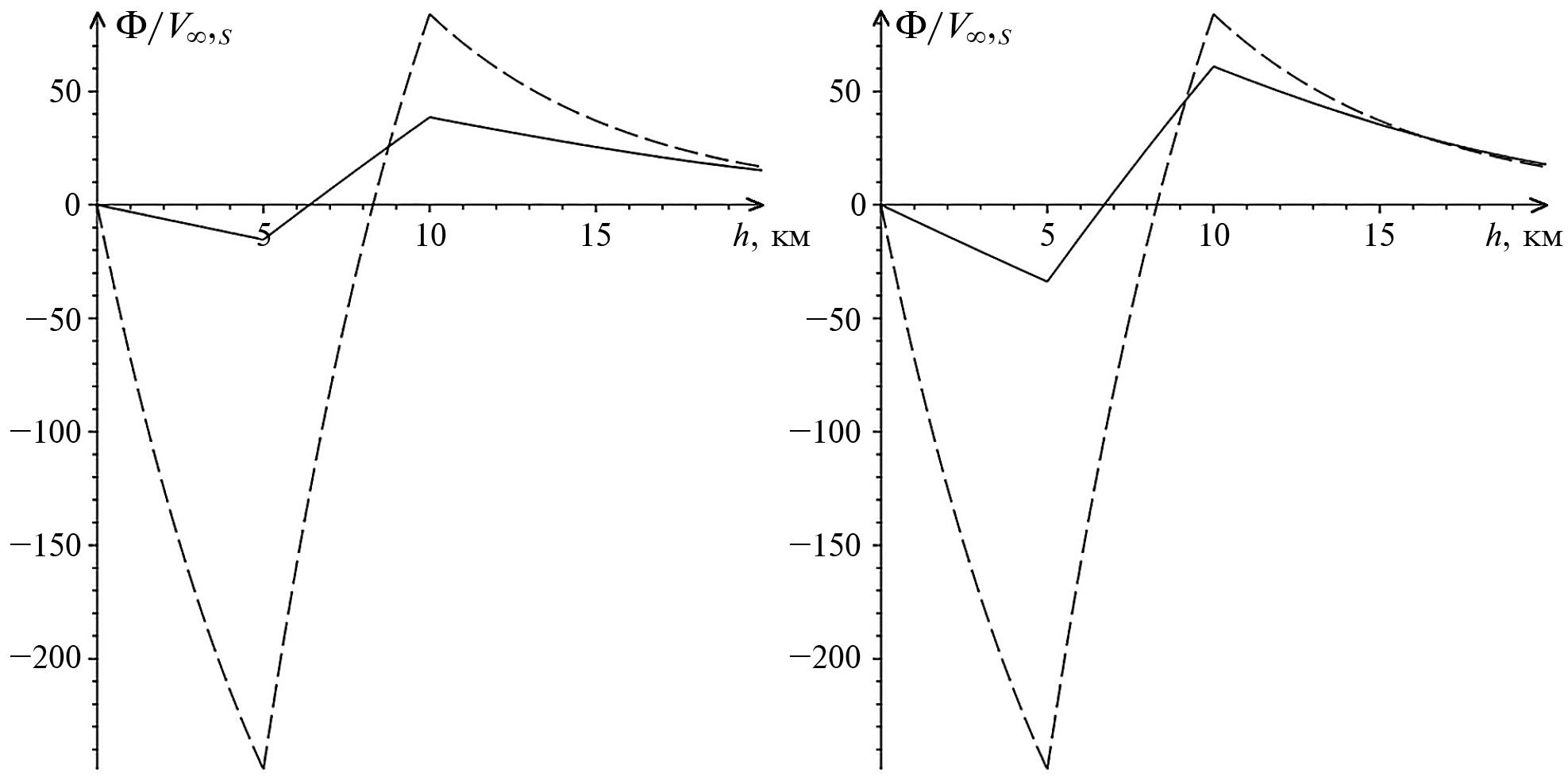 Рис. 3. Графики функций (шриховая линия) в фиксированный момент времени (слева) и (справа) в зависимости от высоты h.