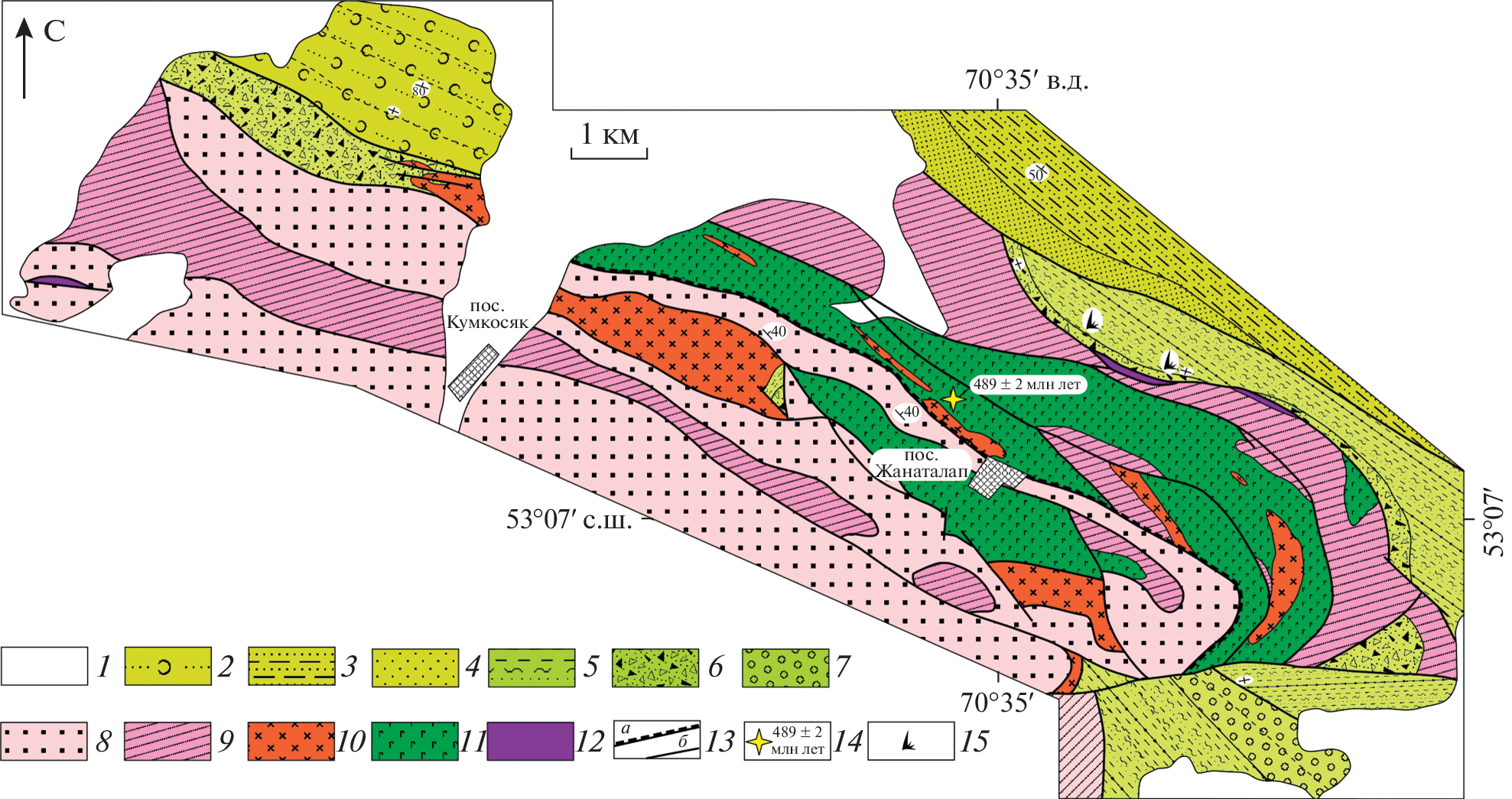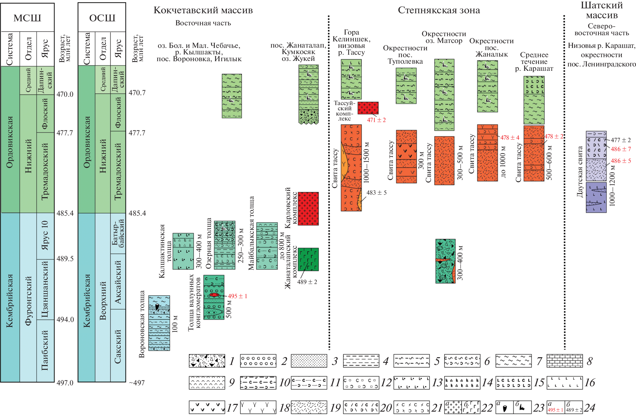 A comprehensive study of the Upper Cambrian and Lower Ordovician complexes of Northern Kazakhstan was carried out, their ages were substantiated, the structures and compositions of the rocks were investigated. It has been ascertained that the Upper Cambrian formations comprise coarse clastic strata, mafic alkaline effusive rocks and gabbro, while felsic volcanic rocks and granites are represented only by boulders in conglomerates. The Lower Ordovician rocks contain basalt-rhyolite series, felsic alkaline volcanic rocks, and granitoids. The lateral rows of structures of the active continental margin have been reconstructed for the Late Cambrian and Early Ordovician. In the Late Cambrian, the lateral series includes only the structures of the rear extension region, where complexes with the within-plate geochemical characteristics were formed. In the lateral series of the Early Ordovician structures, the frontal volcanic area with the island-arc volcanic rocks and the rear extension area with the intraplate felsic volcanic rocks and granites, were revealed. It is assumed that the differences in the lateral rows of structures may be associated with a change in the tectonic mode of the active continental margin at the Cambrian–Ordovician boundary, when the transform mode with no evidence of suprasubduction magmatism was replaced by convergent magmatism accompanied by the wide distribution of island-arc volcanic rocks.