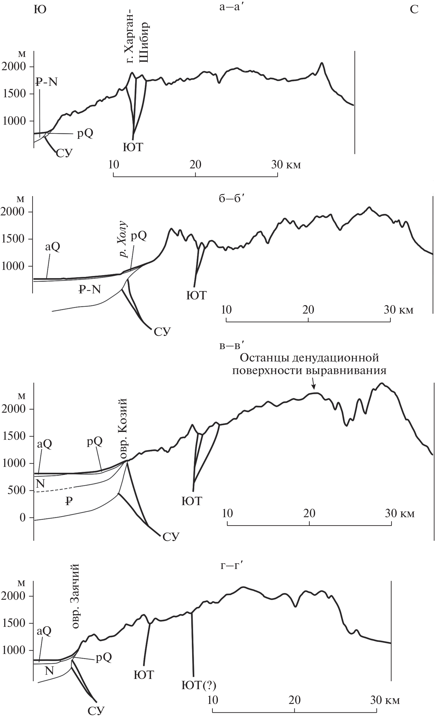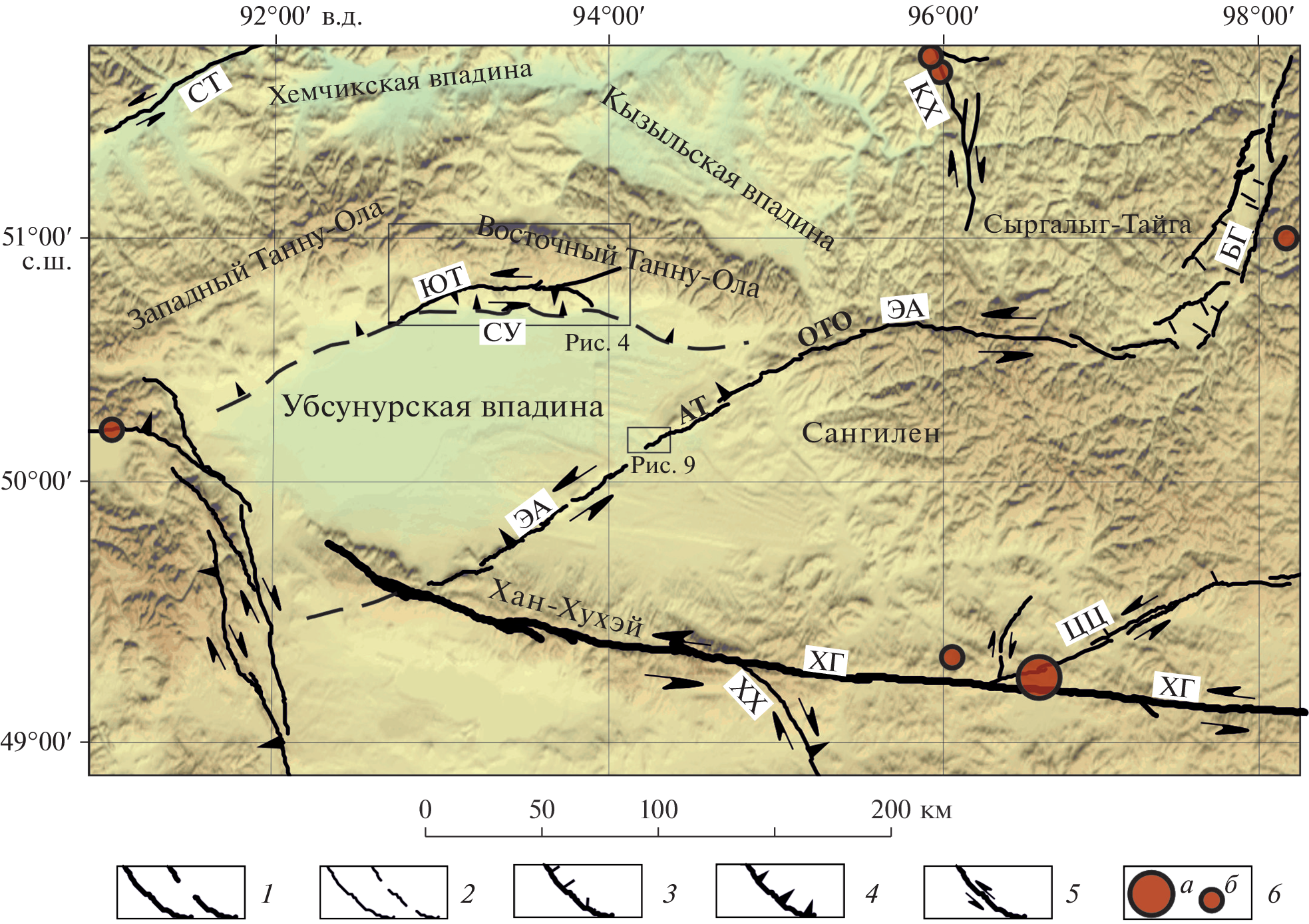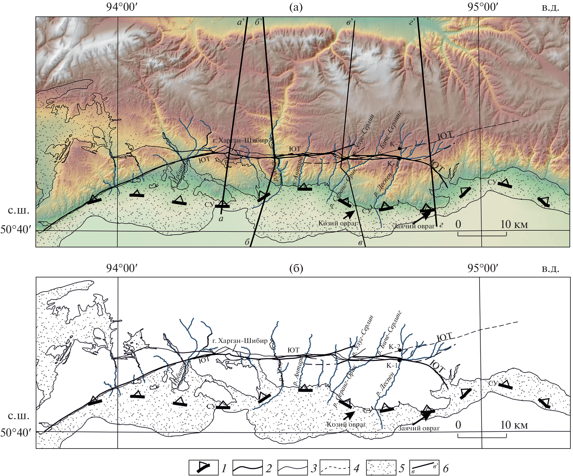 New data on Oligocene-Quaternary sediments, recent (Neogene-Quaternary) structure and active faults of the northern side of the Ubsunur Basin at its boundary with the Tannu-Ola Ridge uplift, based on structural interpretation of remote sensing materials and field work, including trending of active faults, are presented. In the north of the Ubsunur Basin, two parageneses of faults with different geological nature, structural and relief-forming significance were identified. The first paragenesis is represented by the North-Ubsunursky hidden thrust and associated deformations that developed during Neogene‒Quaternary and which form the boundary of the depression and the mountain uplift. The second paragenesis includes the South Tannuol and Erzin-Agordag faults, which cut structures of the first paragenesis and which are active in the Late Pleistocene and Holocene. Periods of intensive development of parageneses replace each other in time.