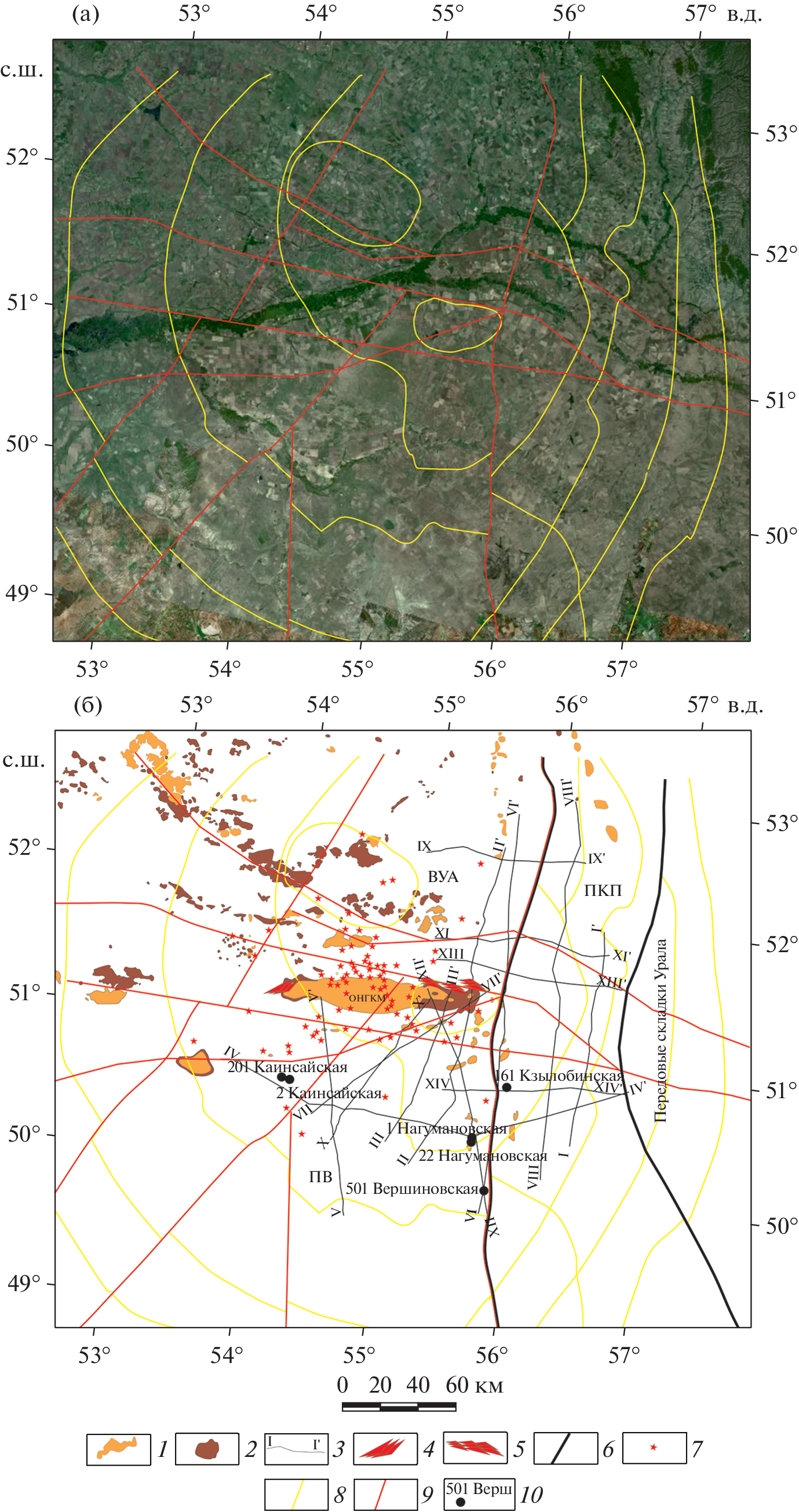 The study of the deep structure of the Orenburg radial-concentric structure in the basement of the Russian Platform based on seismotectonic and geomorphological data has been carried out. Interpretation of temporal regional seismic profiles crossing the structure was performed, identifying the main deep faults and measuring their dip angles. It was revealed that the radial-concentric structure is a large flower structure. Its structure involves the main multidirectional deep faults dipping at angles of \(\perp \)60°–85° and limiting horst or reverse fault zones in the basement. The hierarchy of faults structure has been established. Oil and gas fields are confined to the main deep dislocations of the Orenburg structure and represent flower structures of minor sizes. An experimental modeling of the formation of “flower” structures was performed based on the analysis of the results of studies using data from the acoustic emission activity of rocks and under the action of fluid dynamic loads performed at the “UIK-AE” unit (Institute of Geophysics, Ural Branch of RAS, Russia) on sandstone core samples from reservoir rocks of oil fields in Western Siberia. The developed model showed that the formation of flower structures can occur without horizontal shear due to lateral compression and deep pressure. With the help of the seismo-acoustic emission method, characteristic noise was recorded during the formation of cracks in core samples, sound attenuation before splitting, and then its sharp explosive increase from a break in the continuity of the rock. Analysis of the core of wells drilled within the Orenburg radial-concentric structure revealed signs of hydrothermal fluid discharge in the sedimentary cover rocks, such as wavy (or flat) layering, bizarre textures and intervals of breccias, shell-shaped inclusions, stillotite seams, fluid textures. It is concluded that the genesis of the Orenburg radial-concentric structure is associated with the impact of deep heat flows, fluids, high pressure and has a commonality with the explosive ring structures of shields and platforms.