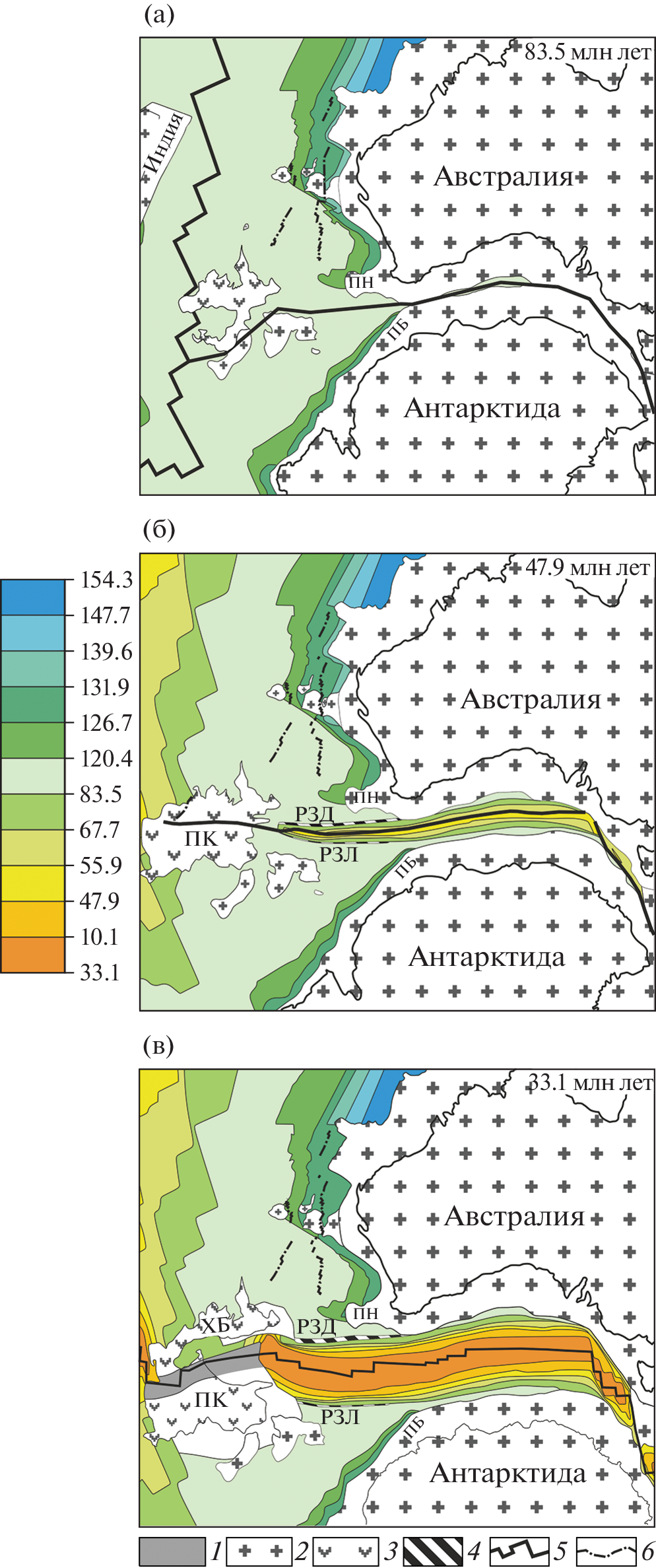 - Munschy M., Dyment J., Boulanger M.O., Boulanger D., Tissot J.D., Schlich R., Rotstein Y., Coffin M.F. Breakup and seafloor spreading between the Kerguelen plateau-Labuan basin and the Broken ridge – Diamantina zone.‒ Proceedings of the Ocean Drilling Program // Sci. Results. 1992. No. 120. P. 931–944.