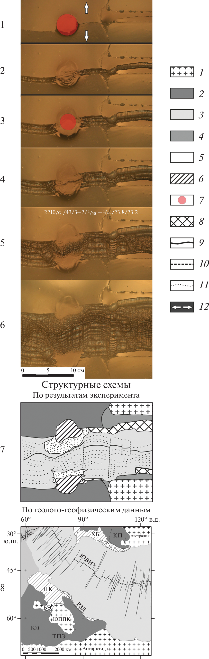 The authors of the article studied the features of the structure formation of the earth’s crust in the early period of the formation of the Southeast Indian Ridge, associated with the separation of Australia from Antarctica and the advancement of the rift zone to the west within the ancient oceanic lithosphere towards the large magmatic province of Kerguelen, formed by the activity of the plume of the same name. The separation of Australia and Antarctica covered a long period of continental rifting (~160‒80 Ma), which then turned into ultra-slow spreading (~80‒45 Ma), then into slow spreading (~45‒40 Ma) and then into stationary spreading at average rates (after 40 Ma). The advance of the rift zone towards the ancient oceanic lithosphere gave way to the accretion of young oceanic crust on the emerging Southeast Indian spreading ridge. The early stages of development of the young spreading ridge are captured in the modern structural plan of the study region. The advance of the rift zone from the continent into the boundaries of the ancient oceanic lithosphere led to the formation of the Naturalist Plateau and the Bruce Bank near the Antarctic margin. The split of the ancient oceanic lithosphere and the formation of a young crust on the Southeast Indian Ridge led to the formation of conjugated Diamantina and Labuan suture zones, fixing the position of the initial rift split. The transition from ultraslow spreading at the initial stage of oceanic crust formation to stationary spreading with medium velocities is clearly recorded in the change in the irregularity of the accretionary relief. The Southeast Indian Spreading Range westward collided with a large igneous province during the formation of the Kerguelen Plateau and separated the Broken Range from the plateau. The authors carried out physical modeling of the conditions for the occurrence of rifting and spreading processes, as well as structure formation in the region of the Southeast Indian Ridge.