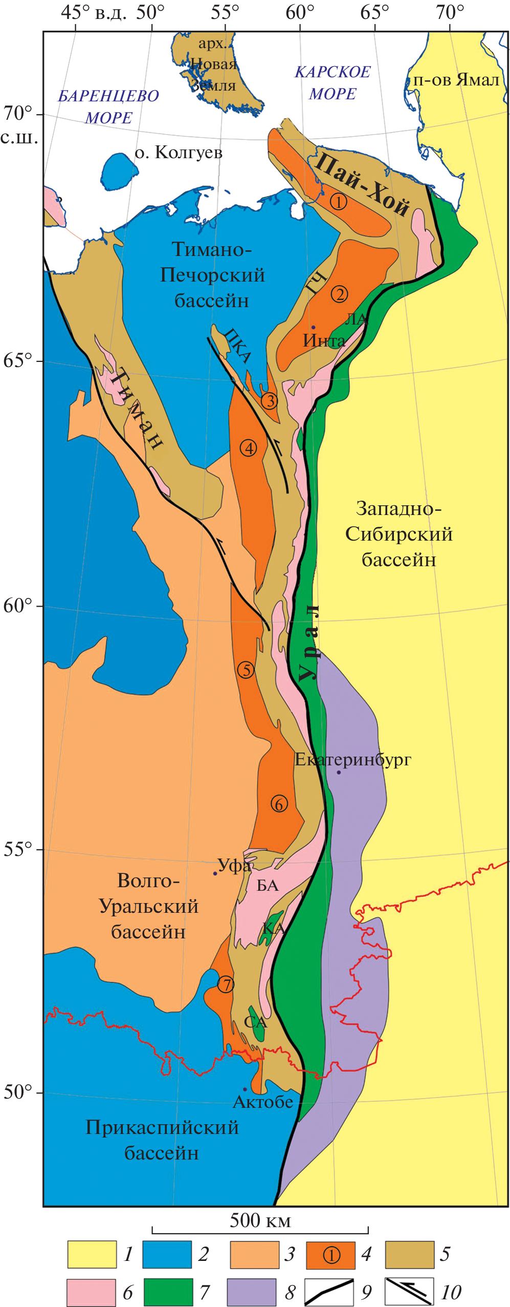The article presents an interpretation of geophysical data characterizing the structure of the frontal fold and thrust zones of the Urals and Pay-Khoi, which show the diversity of structural styles of deformations in the study region. The following structural styles of deformations are considered: classical-style thrust zones, which are in-sequence thin-skinned imbrication systems (i); areas of distribution of wedge-shaped allochthons, composed of duplex tectonic plates that are not reflected in the sub-surface layers (ii); inversion zones where faults associated with Ural rifting are transformed into thrust faults (iii); areas whose structure is determined by the deformation of salt diapirs and extrusion of salt (iv); zone, tectonic thickening of the Precambrian complexes overlain by the Paleozoic cover (v). Interpretation of historical and new data on the structure of fold belts makes it possible to significantly update understanding of the structure and development of areas such as zones of wedge-shaped thrusts, areas of development of squeezed salt diapirs, and areas where reactivation and tectonic thickening of Precambrian complexes occurred due to the reactivation of pre-existing faults. New seismic data provided constraints on the magnitude of horizontal displacements in the thrust zones as well as timing of shortening. For the first time they have revealed the development of arrays of small-scale protothrusts.