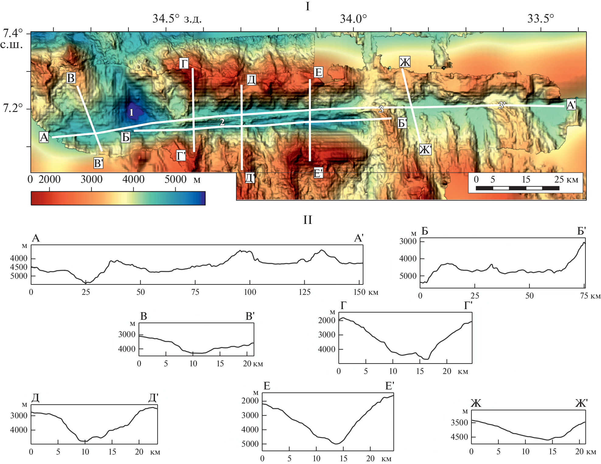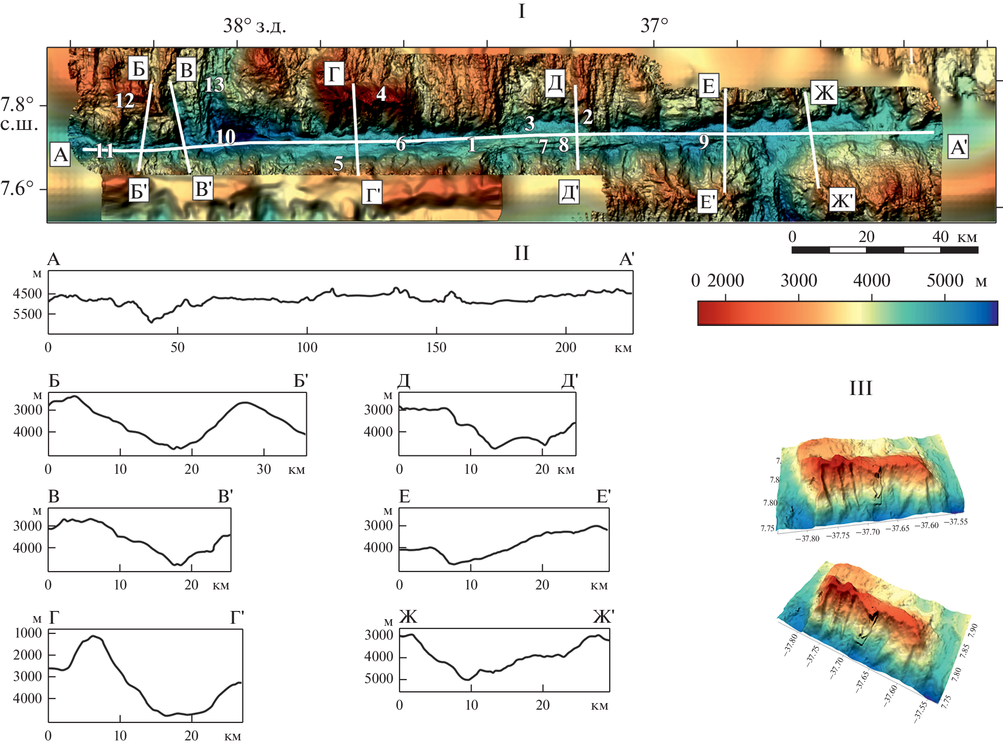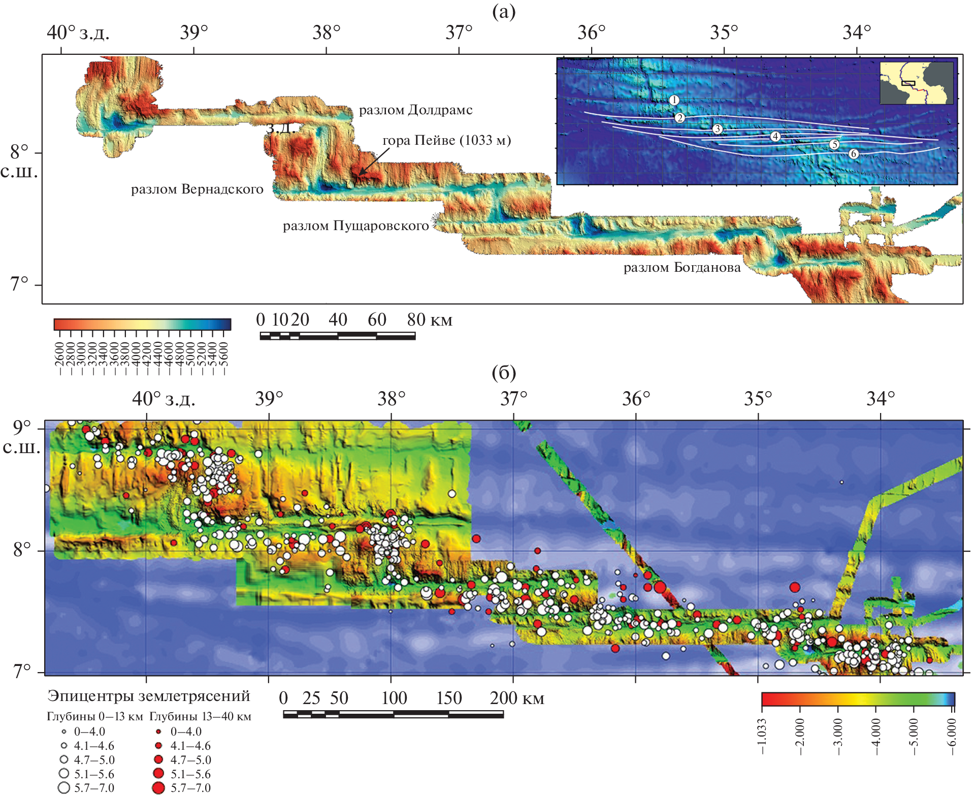 This article presents results of the structural and morphological analysis of the fracture zones which are part of Doldrums Megatransform System (MTS), located in the northern part of the Equatorial Atlantic (6.5°–9° N) that include Vernadskiy and Bogdanov transform faults and the Doldrums and Pushcharovskiy megatransforms. Bathymetric map, based on the multibeam echo sounding data, collected during 45 cruise of the R/V Akademik Nikolaj Strakhov was used for this analysis. It was established that large-scale variations in the width of fracture zone valleys are determined by the distribution of stresses perpendicular to the fracture zone. In the areas with compressive stresses, the fracture zone valleys are narrower, and the in extension areas are wider. The difference in geodynamic settings within the MTS is due to the difference in spreading directions, which change from \(\perp \)89° to \(\perp \)93° when moving from south to north. The depth of fracture zone valleys consistently increases from the periphery of the MTS (Bogdanov and Doldrums faults) to the center (Pushcharovskiy fracture zone) in accordance with a decrease in the upper mantle temperature. In each fracture zone, the valley depth decreases from the rift- fracture zone intersections towards the center of the active part to a certain background depth. It is assumed that this phenomenon is the result of the uplift of the valley bottom, which occurred due to the decompaction of the lithosphere, caused by the serpentinization of ultramafic rocks. The violation of the revealed variations in the width and depth of fracture zone valley patterns occurs as a result of various ridges and uplifts formation in the fracture zone. In the axial zones of the active parts of the fracture zone valleys median ridges are widespread, extending parallel to the fracture zone and representing serpentinite diapirs squeezed out above the bottom surface. Transversal ridges which were formed 10‒11 million years ago as a result of the lithospheric plate edge flexural bending under extensional conditions are now located in the western passive parts on the southern sides of the of Doldrums and Pushcharovskiy fracture zone valleys. The transverse ridge on the northern side of the Vernadskiy fracture zone, which includes Mount Peyve, was formed between 3.65‒2.4 Ma. Due to the frequent jumps of the spreading axis in this region, it was divided into three segments. There are interfracture zone ridges in megatransforms, which in the active part consist of two fracture zone valleys. Time of their formation: in Pushcharovskiy megatransform ‒ 30‒32 million years ago and in Doldrums megatransform ‒ about 4 million years ago. Due to the curvilinearity of the outlines and under the pressure of moving lithospheric plates, the interfracture zone ridges experience longitudinal (along the fault) compressive and tensile stresses, which are compensated by vertical uplifts of their separate blocks and the formation of depressions, pull apart depressions, and spreading centers (the latter are only in Pushcharovskiy megatransform). Structure-forming processes that determine pattern and morphology of the fracture zones as a part of the MTS are related by their origin to the spreading and transform geodynamic systems.