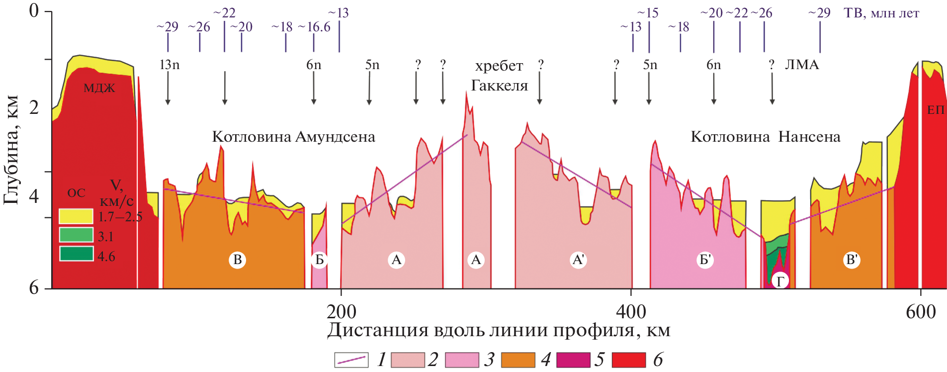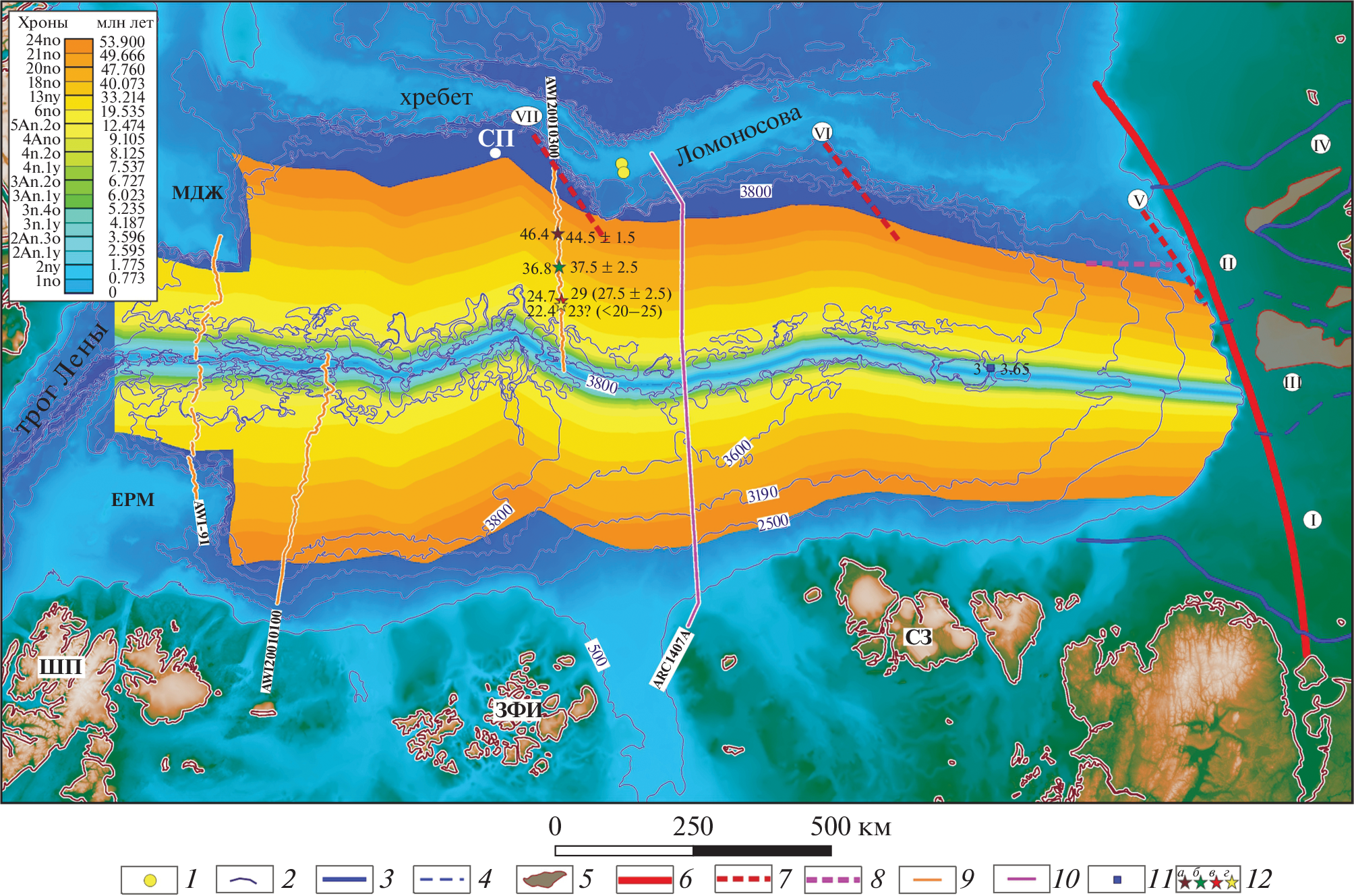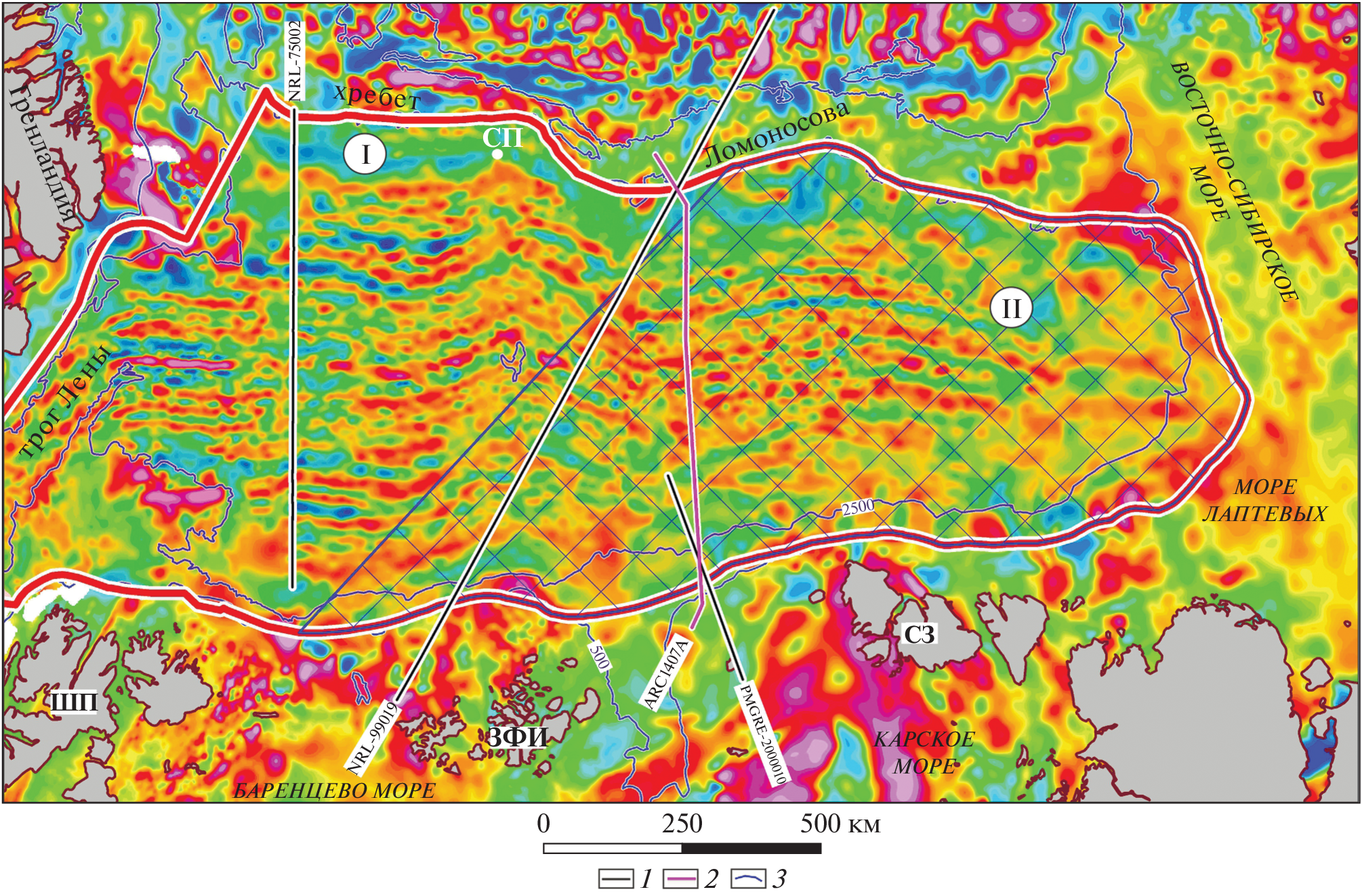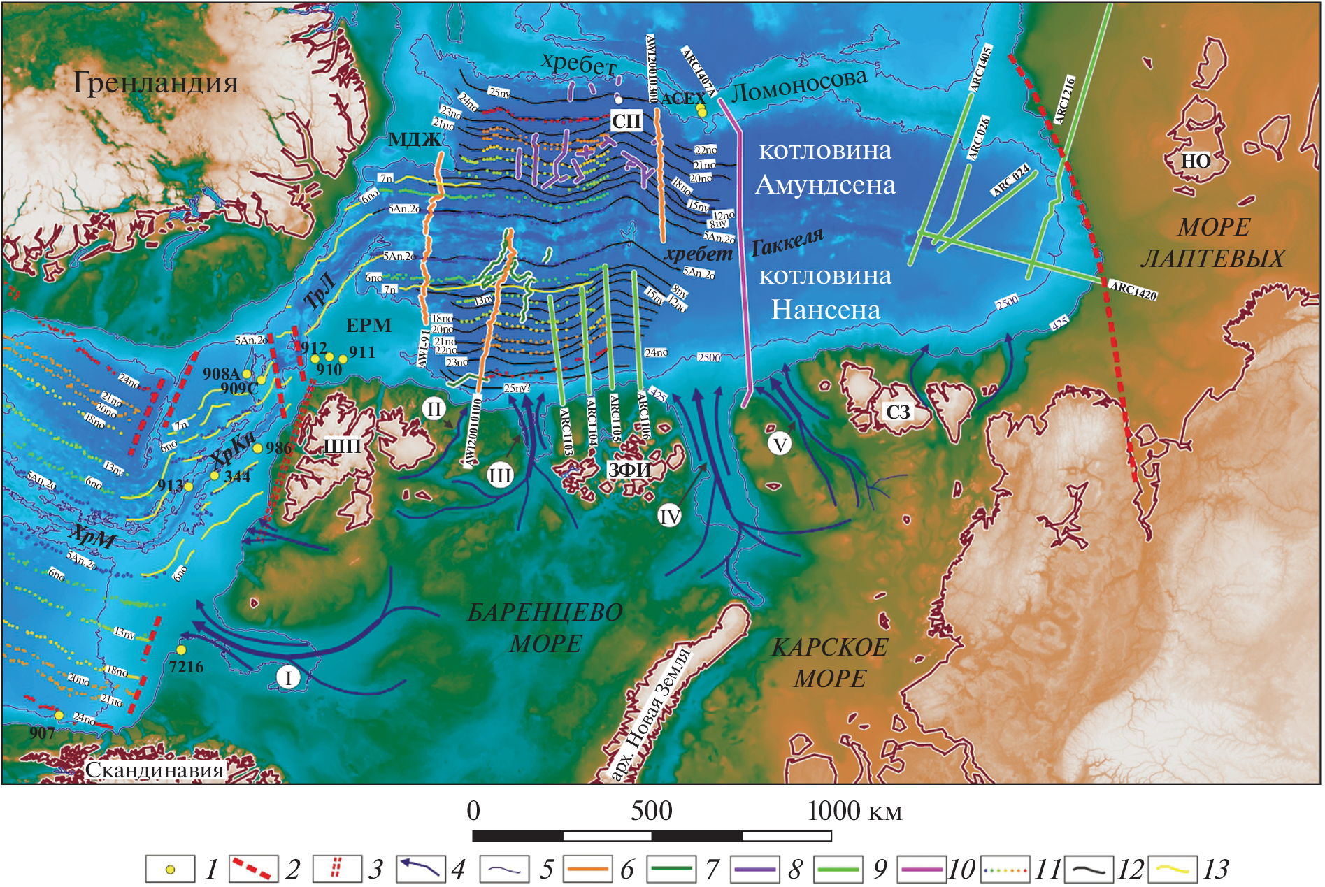 - Jokat W., Weigelt E., Kristoffersen Y. et al. New geophysical results from the south-western Eurasian Basin (Morris Jesup Rise, Gakkel Ridge, Yermak Plateau) and the Fram Strait // Geophys. J. Int. 1995. Vol. 123. P. 601–610.