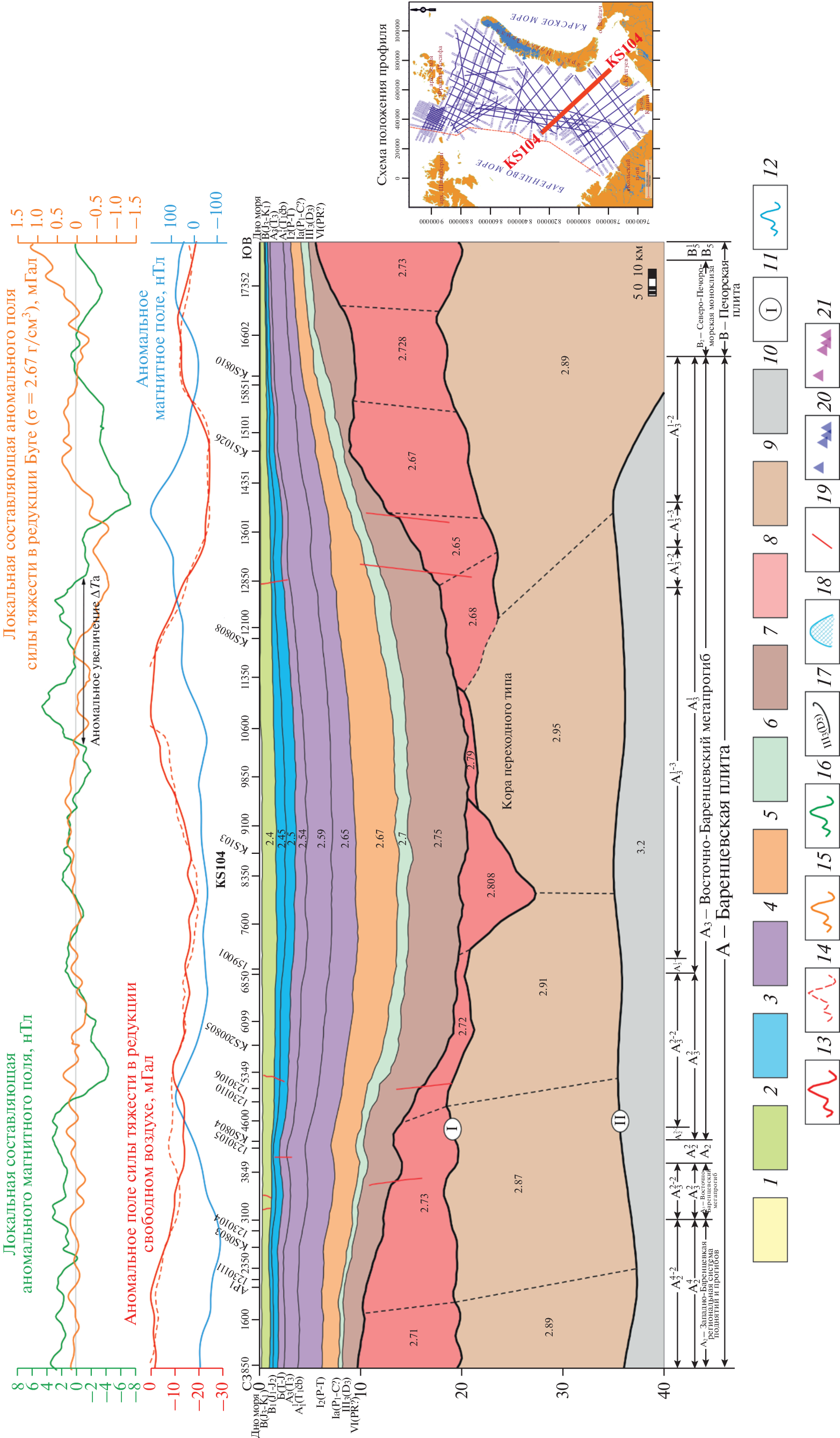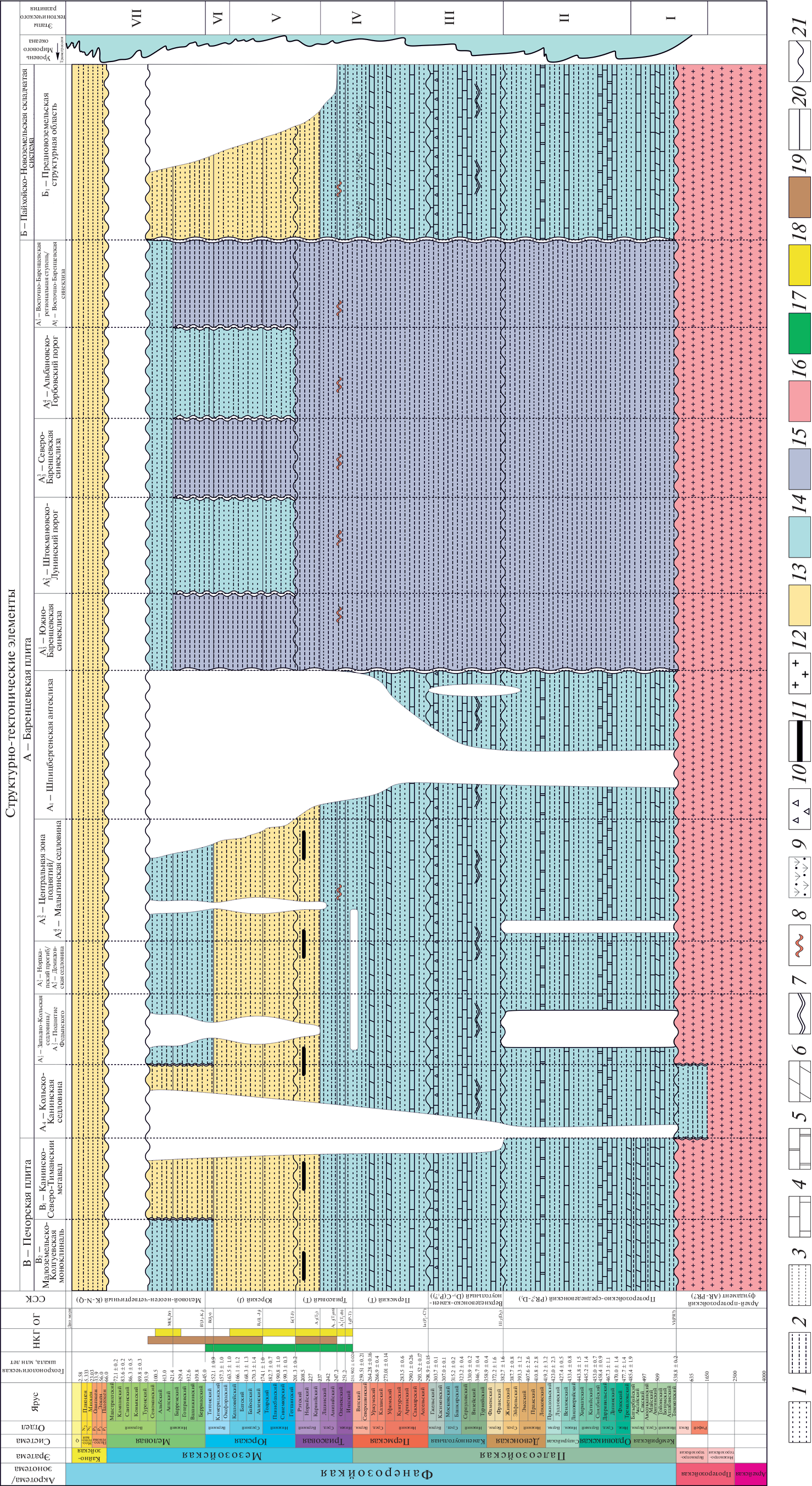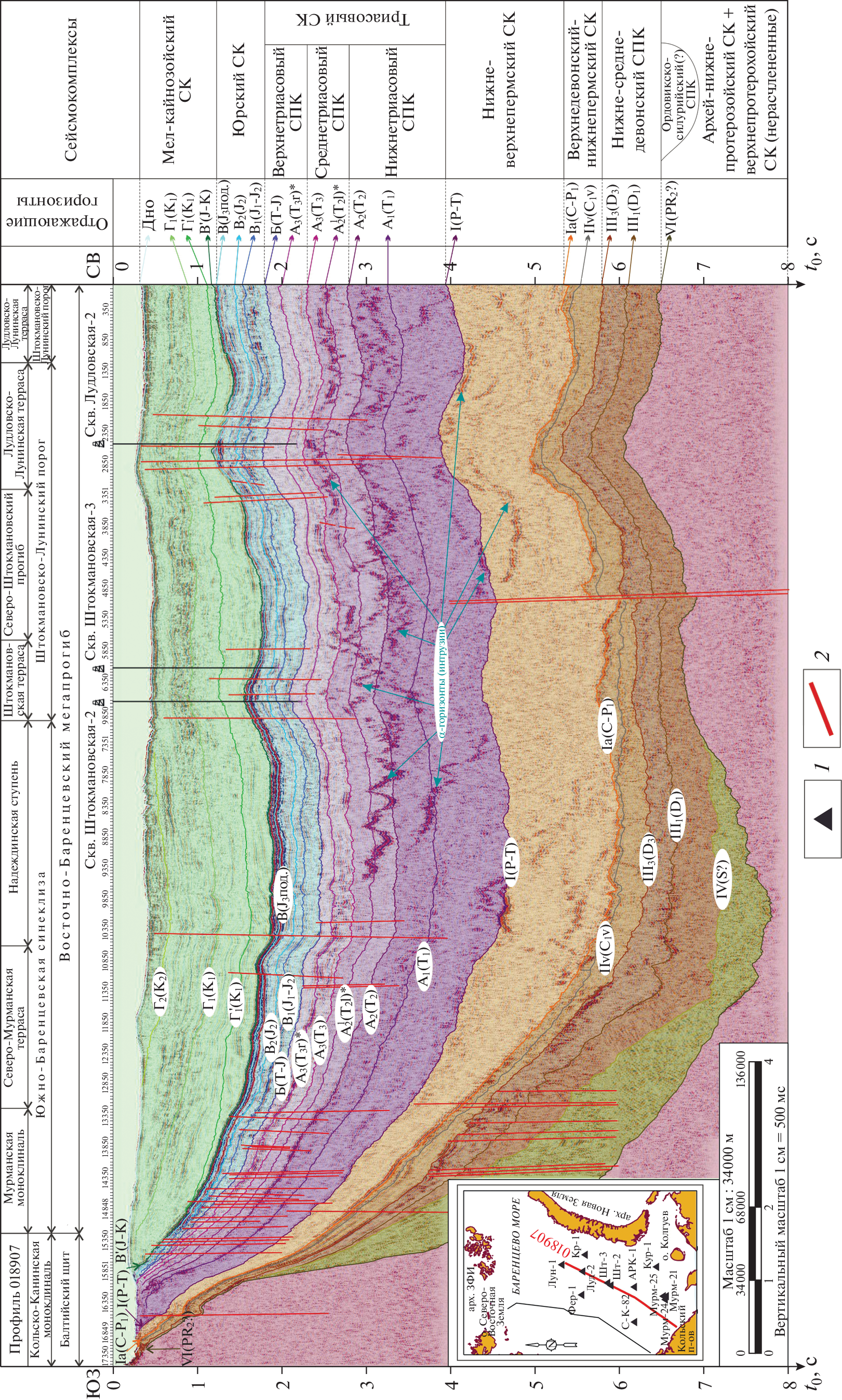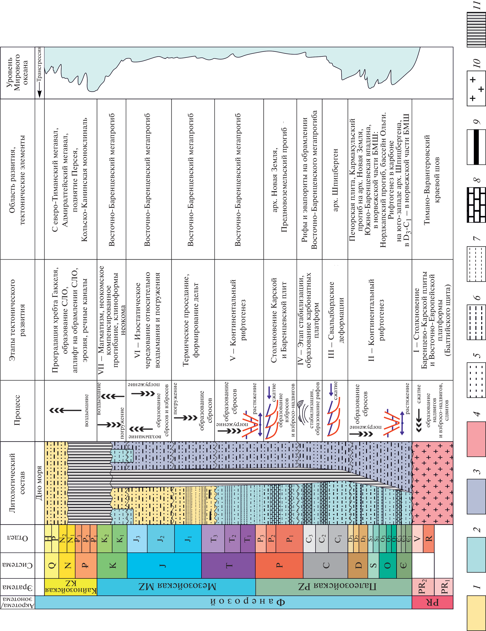 Based on the results of field complex geophysical studies in the northwestern part of the Russian sector of the Barents Sea shelf, as well as on the processing and comprehensive interpretation of new and retrospective geophysical materials in the volume of 25 500 linear kilometers and deep well drilling data in the section of the Barents Sea sedimentary cover identified regional tectonostratigraphic units: (i) Paleozoic complex (between reflecting horizons VI(PR? ) and I2(P‒T)); (ii) the Triassic complex (between reflecting horizons I2(P‒T) and B(T‒J)); (iii) the Jurassic complex (between reflecting horizons B(T‒J) and V′(J3‒K1)); (iv) the Cretaceous‒Cenozoic complex (between reflecting V′(J3‒K1) and the Barents sea floor). According to the structural analysis’ results, three structural floors are established: the lower structural floor, which includes Riphean terrigenous-affusive sediments and Lower Paleozoic‒Lower Permian terrigenous-carbonate sediments; the middle structural floor is formed mainly by carbonate sediments of Upper Devonian‒Lower Permian; the upper structural floor combines terrigenous sediments of Lower and Upper Permian, Mesozoic and Cenozoic sediments. The authors present a new tectonic model of the Barents Sea region, including elements of all structural floors with subfloors. In accordance with the tectonic zoning, paleostructural and paleotectonic analyses, the article outlines the main stages of the Barents Sea shelf development: stage of the Late Proterozoic compression and Early-Middle Paleozoic continental rifting (I), Late Paleozoic stabilization stage (II), Early Mesozoic tectogenesis stage (III), Middle Mesozoic thermal subsidence stage (IV), Late Jurassic stabilization stage (V), Cretaceous sagging stage (VI) and the final stage as a Cenozoic uplift over a large part of the Barents Sea shelf (VII). In the northwestern part of the Russian sector of the Barents Sea shelf, synchronous dipping of the sedimentary cover basement took place, associated with spreading and formation of the Arctic Ocean.
