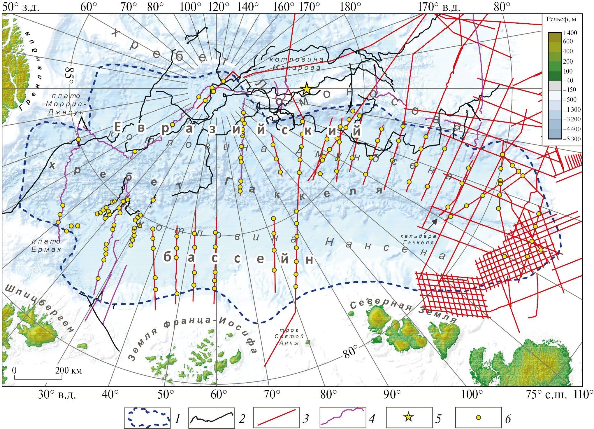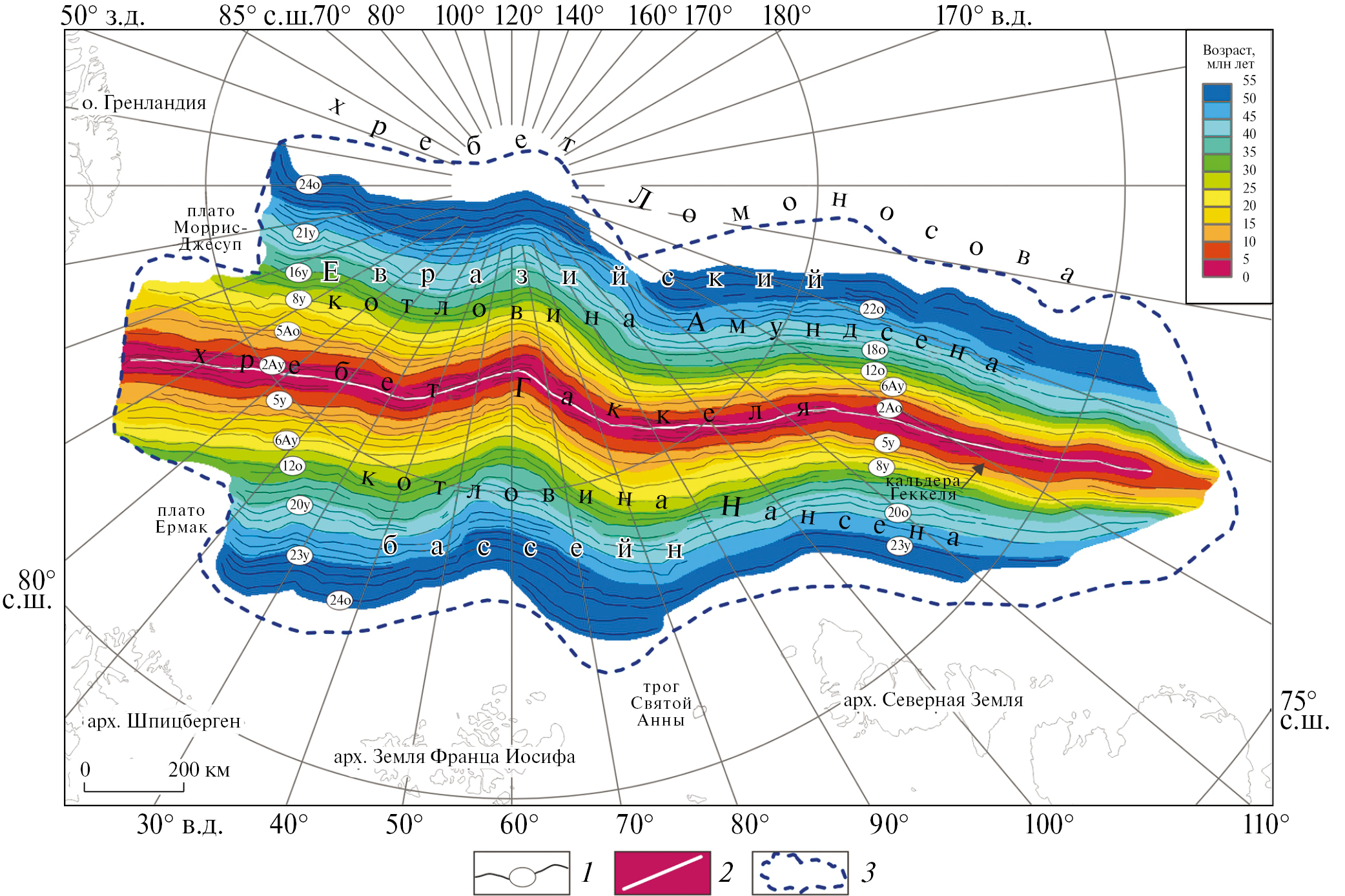 Возраст океанической коры устанавливался по результатам изучения аномального магнитного поля. За последние 30 лет небольшой объем магнитометрических данных получен только в самом восточном (Прилаптевоморском) замыкании бассейна, а также вдоль нескольких профилей экспедиции “Арктика-2020” [6] (см. рис. 1).