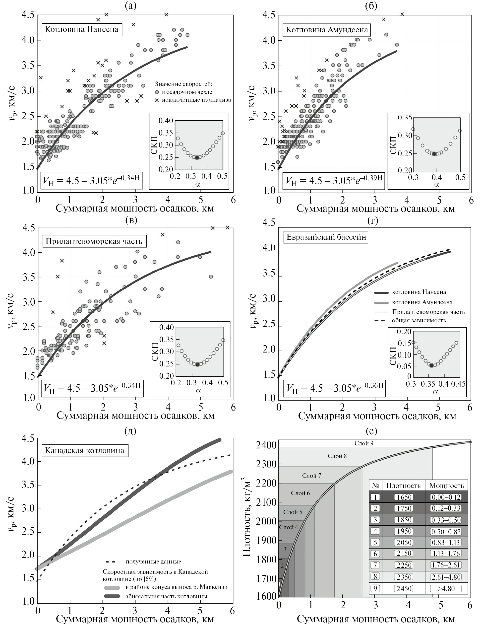 (а)‒(г) — осредненные кривые скорость/мощность: (а) — котловина Нансена, (б) — котловина Амундсена, (в) — Прилаптевоморская часть Евразийского бассейна; (г) — Евразийский бассейн; (д) — сопоставление зависимостей скорость/мощность; (е) — зависимость плотность/мощность для Евразийского бассейна и разделение чехла на слои со средними значениями плотностей.