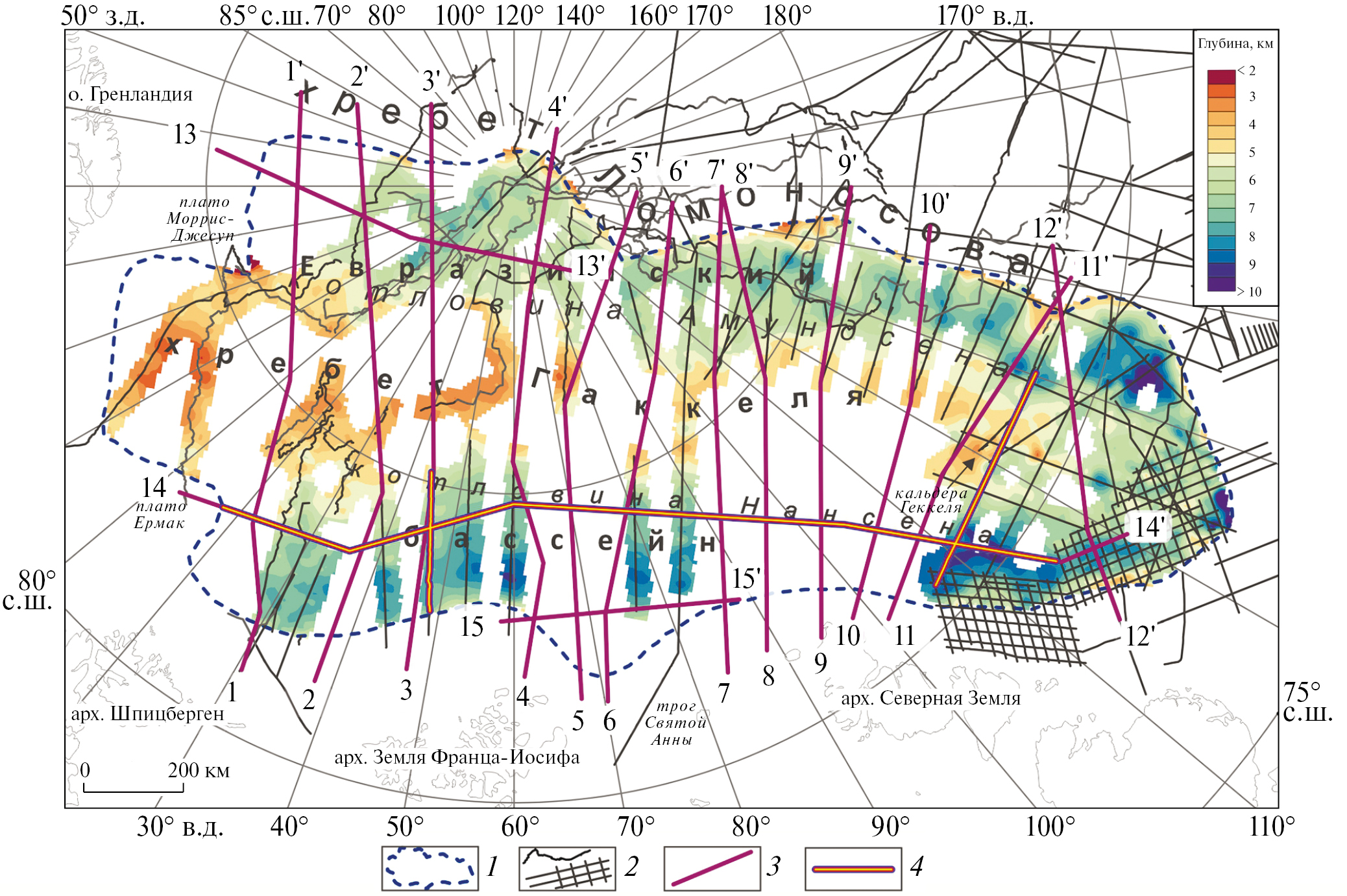 По мере поступления новых сейсмических данных цифровые модели рельефа поверхности фундамента и мощности осадочного чехла неоднократно актуализировались [57, 68]. Однако эти модели основывались исключительно на данных МОВ, которых с годами хотя и становилось больше, но не во всех частях Евразийского бассейна. Полностью неизученной поныне остается значительная часть котловины Нансена (см. рис. 1).