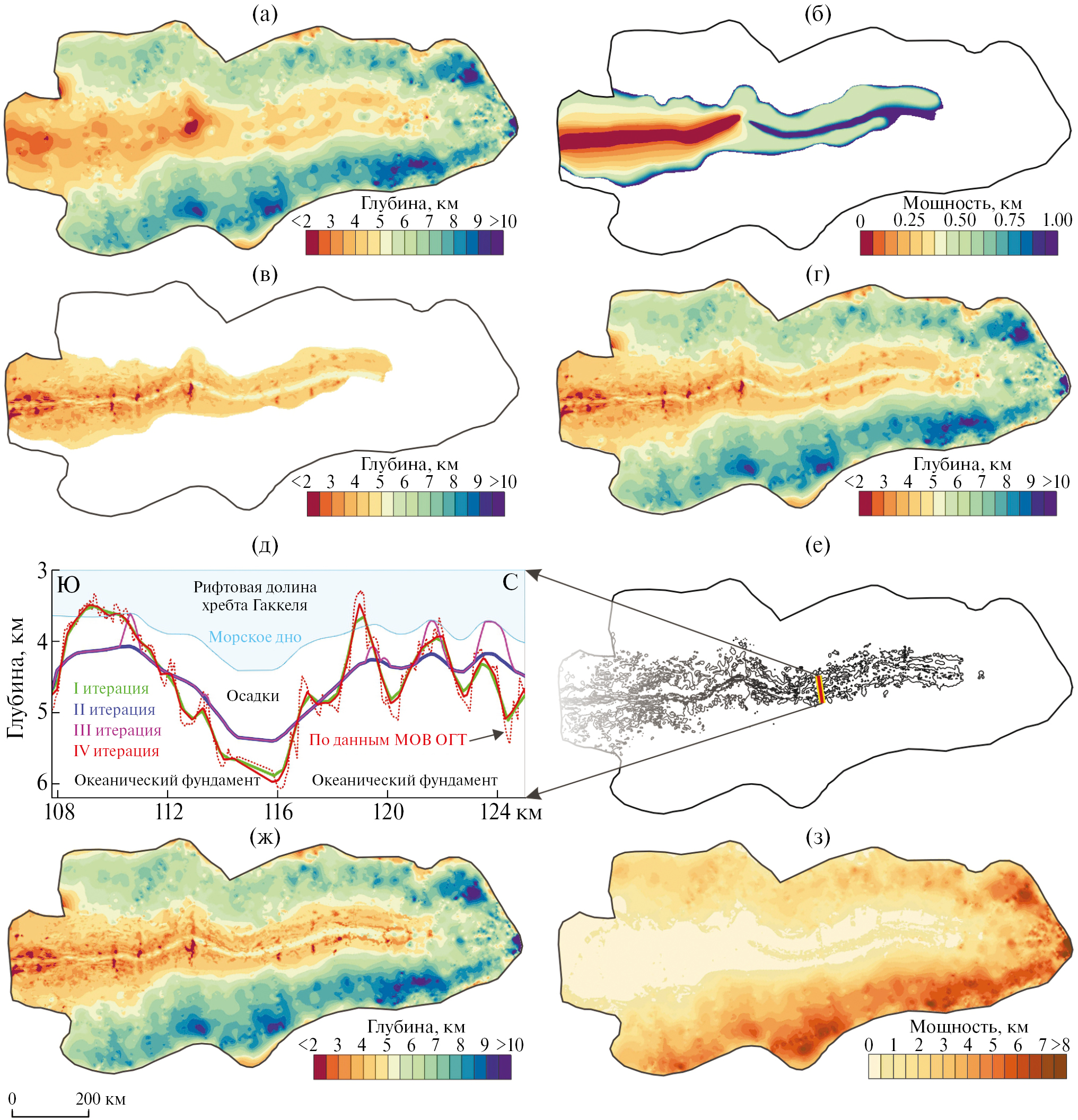 Количество слоев выбиралось нами, исходя из принципа выбора значений плотности от минимального 1650 кг/м3 с шагом 100 кг/м3 и расчетом мощностей слоев, для которых эти значения являются средними, согласно установленной зависимости ρ(H). Показаны границы выбранных девяти слоев Евразийского бассейна (см. рис. 2, е). Эти слои, с присвоенными им значениями средних плотностей мы использовали при 2D, а также 3D моделировании.