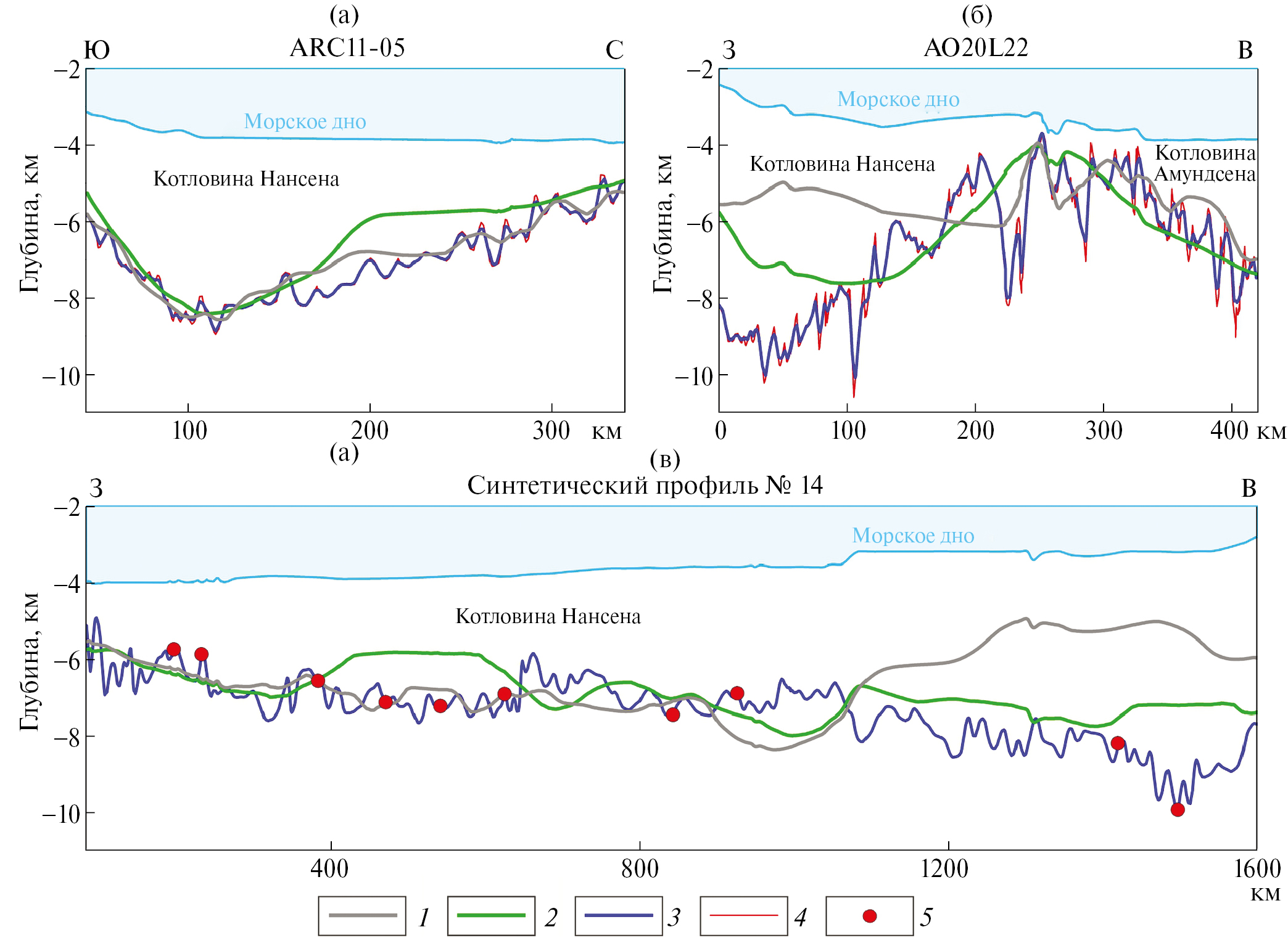 Добавление синтетических профилей. В связи с отсутствием в некоторых частях Евразийского бассейна профилей МОВ ОГТ с экспериментально определенными глубинами фундамента, для их заполнения были добавлены пятнадцать синтетических профилей для последующего 2D гравитационного моделирования. Показана общая сеть профилей, составляющая сводную базу данных по рельефу поверхности фундамента (см. рис. 3).