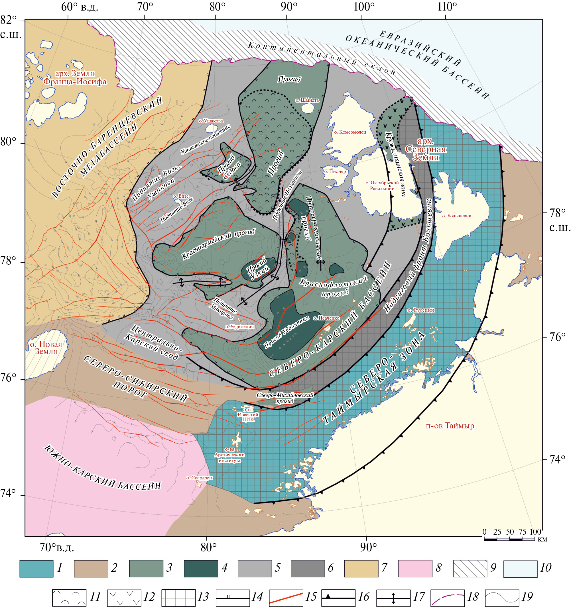 1‒2 ‒ области складчатости: 2 ‒ байкальской, 2 ‒ герцинской; 3 ‒ ордовикские рифтовые бассейны; 4 ‒ депоцентры рифтовых бассейнов; 5 ‒ поднятия и инверсионные валы, перекрытые чехлом; 6 ‒ позднепалеозойский надвиговый фронт; 7‒8 ‒ рифтинг: 7 ‒ позднедевонский (Восточно-Баренцевский бассейн), 8 ‒ позднетриасовый‒юрский (Южно-Карский бассейн); 9 ‒ континентальный склон; 10 ‒ океанический бассейн; 11 ‒ области соляной тектоники; 12 ‒ ранне-среднеордовикская вулканическая дуга (Кружилихинская зона); 13 ‒ неопротерозойско‒кембрийские метаморфические комплексы и турбидиты; 14 ‒ границы тектонических элементов; 15 ‒ разрывные нарушения; 16 ‒ надвиги; 17 ‒ инверсионные валы; 18 ‒ бровка шельфа; 19 ‒ изогипсы акустического фундамента (км)