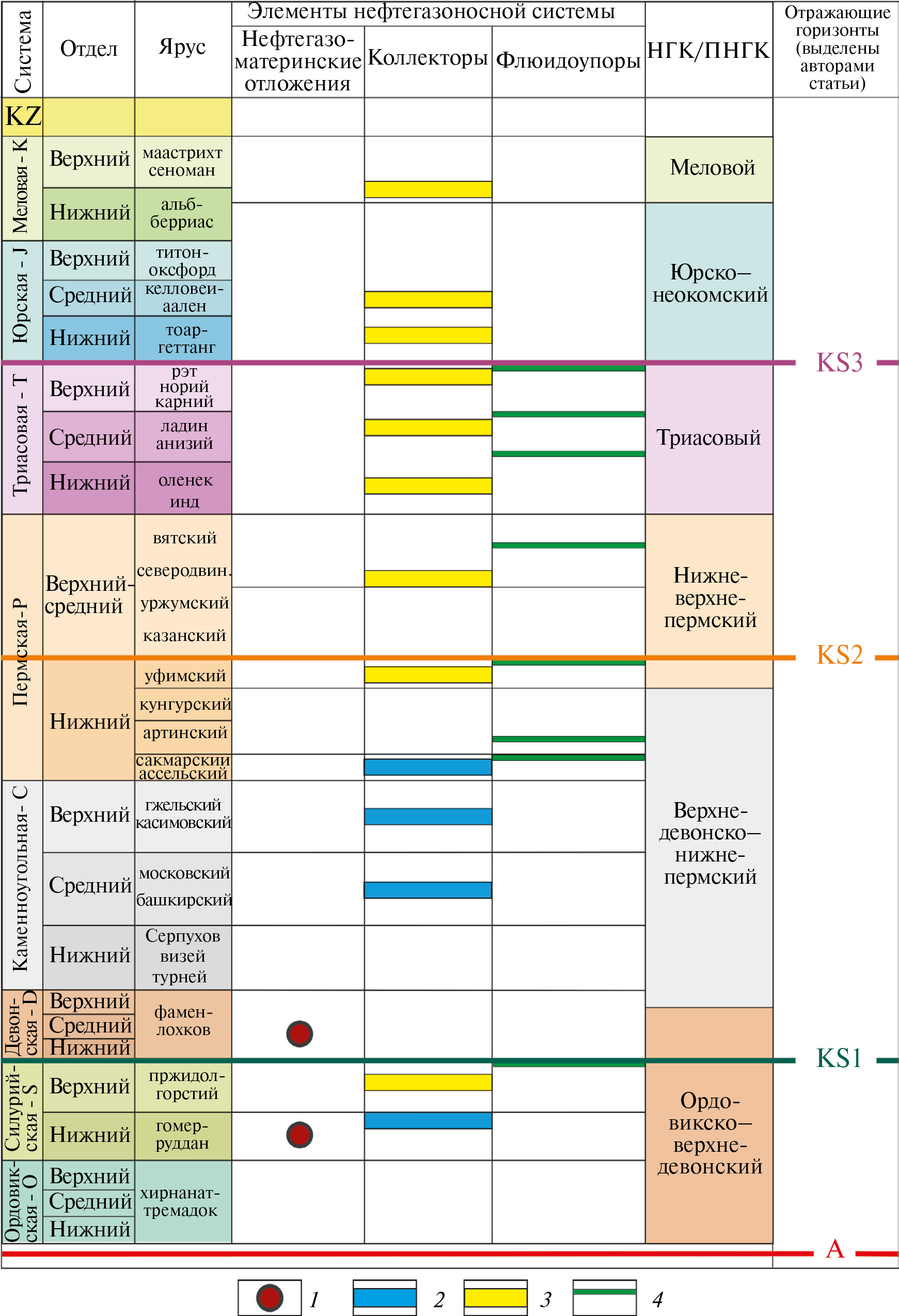1 ‒ нефтематеринские породы; 2‒3 ‒ коллекторы: 2 ‒ карбонатные, 3 ‒ терригенные; 4 – флюидоупоры